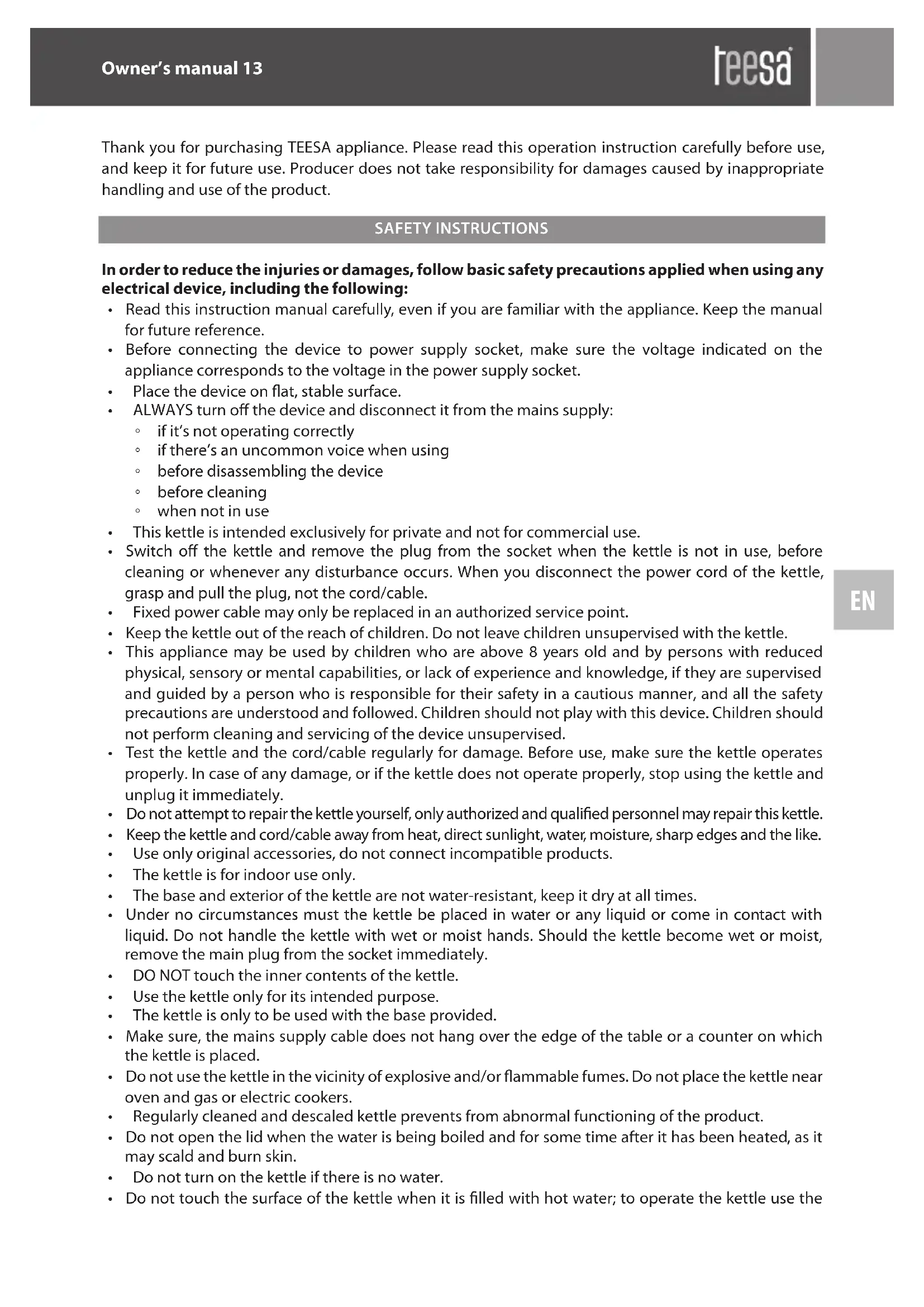 Thank you for purchasing TEESA appliance. Please read this operation instruction carefully before use, and keep it for future use. Producer does not take responsibility for damages caused by inappropriate handling and use of the product. SAFETY INSTRUCTIONS In order to reduce the injuries or damages, follow basic safety precautions applied when using any electrical device, including the following:
