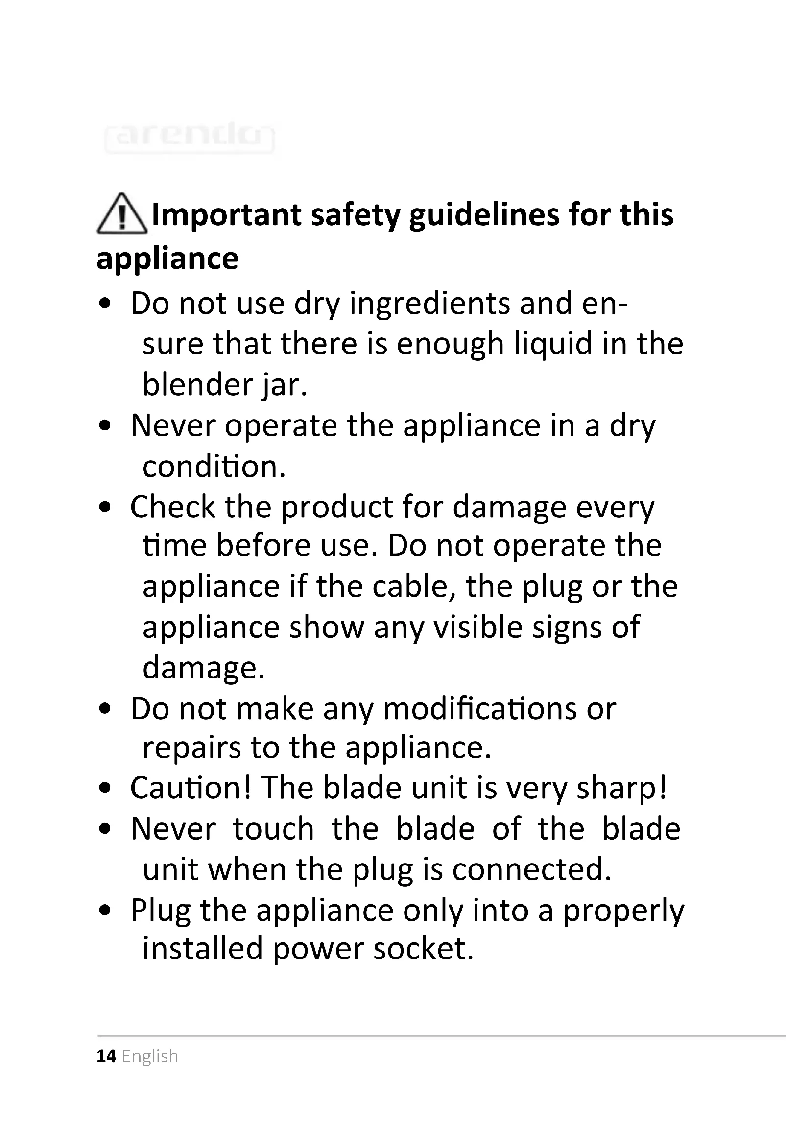 Thoroughly clean the parts that come into contact with food before using the appliance for the first time. Allow hot ingredients to cool down before blending (max. Temperature 60^ C). Cut large ingredients into 2 cm pieces before blending. Use the appliance only on a flat surface.
