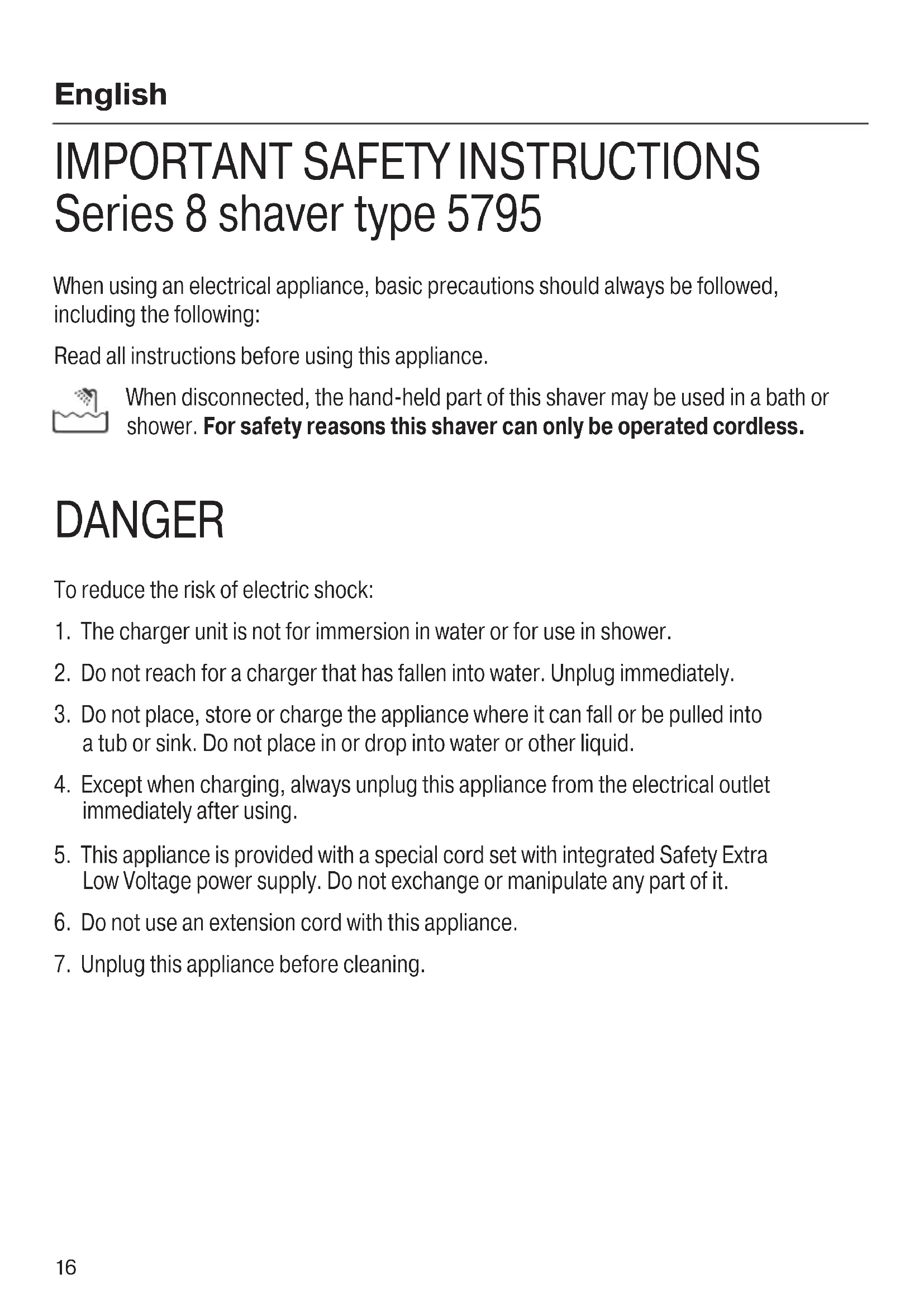 Series 8 shaver type 5795 When using an electrical appliance, basic precautions should always be followed, including the following: Read all instructions before using this appliance. When disconnected, the hand-held part of this shaver may be used in a bath or shower. For safety reasons this shaver can only be operated cordless. DANGER To reduce the risk of electric shock: