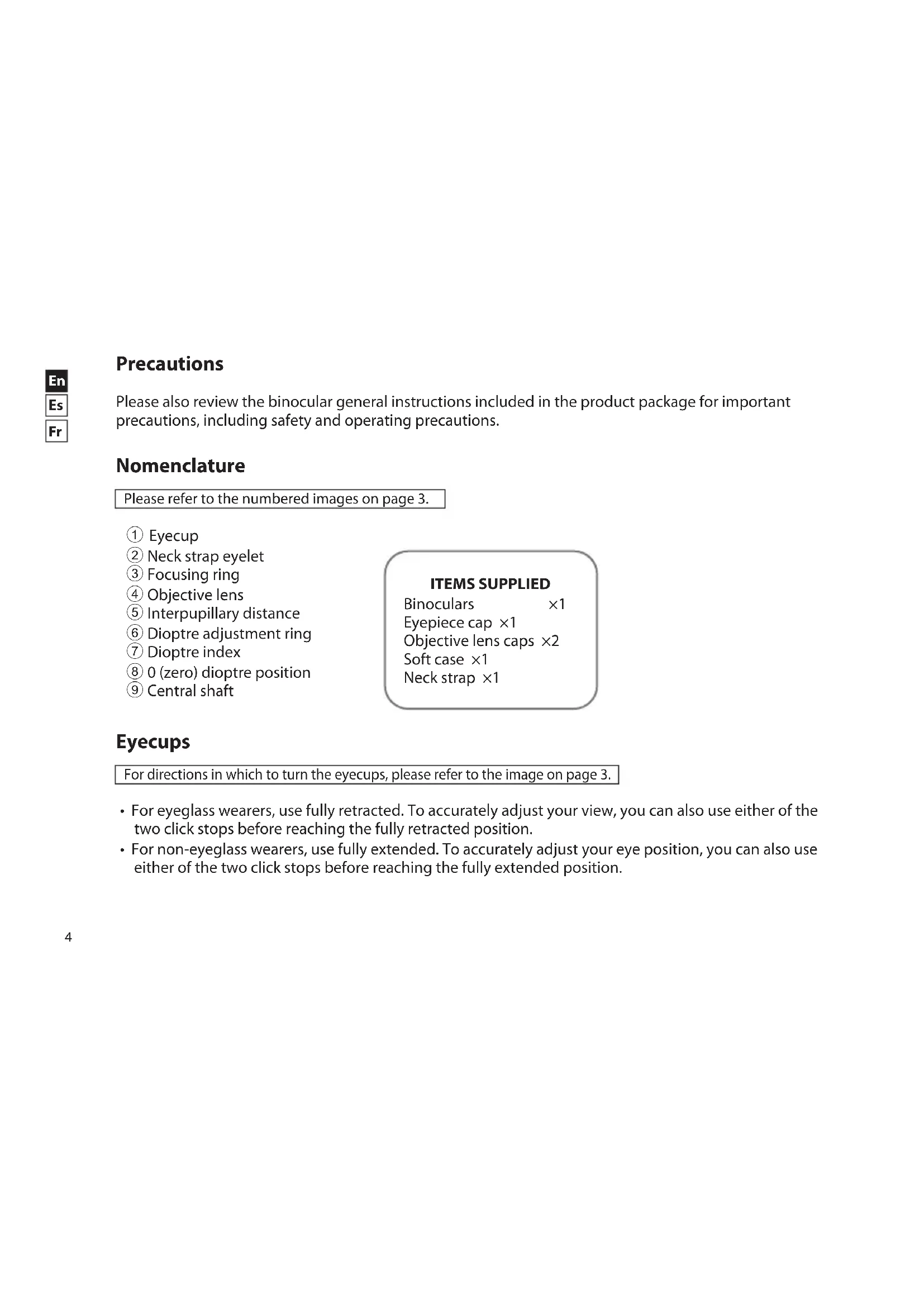 Precautions Please also review the binocular general instructions included in the product package for important precautions, including safety and operating precautions. Nomenclature Please refer to the numbered images on page 3. 1 Eyecup 2 Neck strap eyelet 3 Focusing ring 4 Objective lens 5 Interpupillary distance 6 Dioptre adjustment ring 7 Dioptre index 8 0 (zero) dioptre position 9 Central shaft ITEMS SUPPLIED Binoculars ×1 Eyepiece cap ×1 Objective lens caps ×2 Soft case ×1 Neck strap ×1 Eyecups For directions in which to turn the eyecups, please refer to the image on page 3.