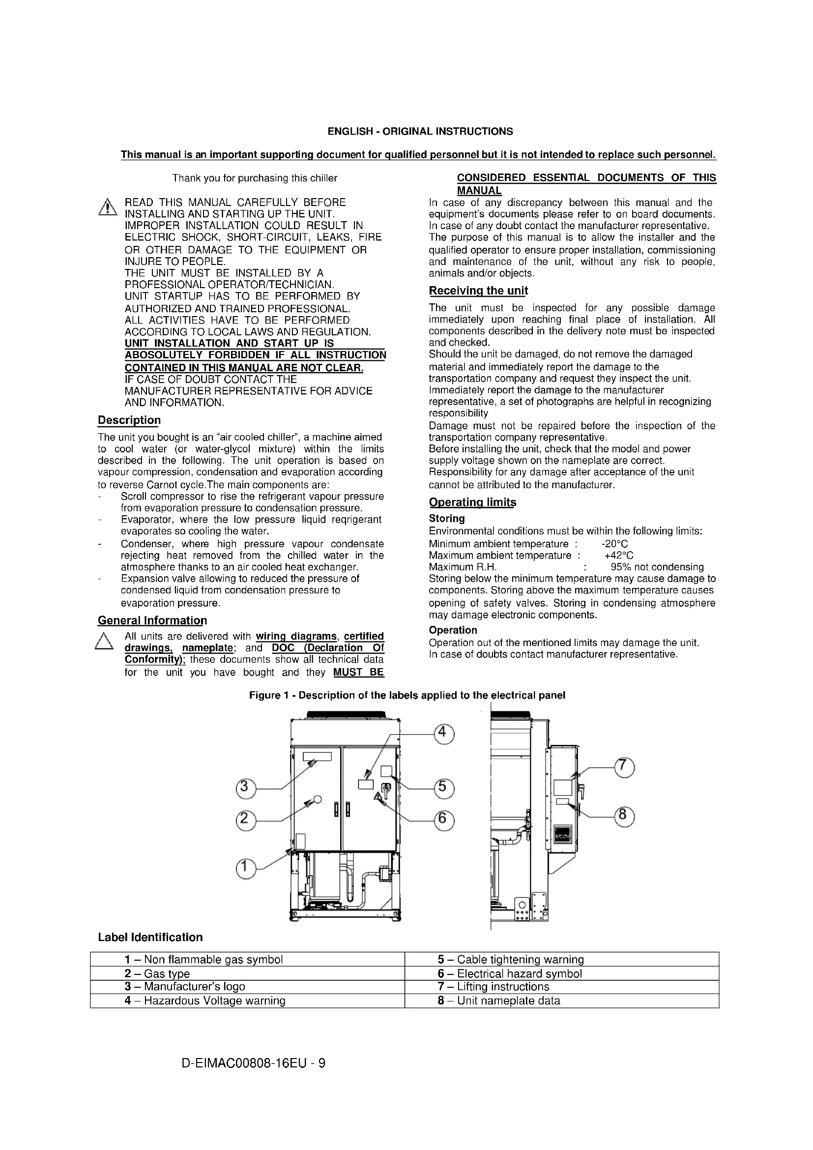 MANUAL In case of any discrepancy between this manual and the equipment’s documents please refer to on board documents. In case of any doubt contact the manufacturer representative. The purpose of this manual is to allow the installer and the qualified operator to ensure proper installation, commissioning and maintenance of the unit, without any risk to people, animals and/or objects. Receiving the unit The unit must be inspected for any possible damage immediately upon reaching final place of installation. All components described in the delivery note must be inspected and checked. Should the unit be damaged, do not remove the damaged material and immediately report the damage to the transportation company and request they inspect the unit. Immediately report the damage to the manufacturer representative, a set of photographs are helpful in recognizing responsibility Damage must not be repaired before the inspection of the transportation company representative. Before installing the unit, check that the model and power supply voltage shown on the nameplate are correct. Responsibility for any damage after acceptance of the unit cannot be attributed to the manufacturer. Operating limits Storing Environmental conditions must be within the following limits: Minimum ambient temperature : -20°C Maximum ambient temperature : +42°C Maximum R.H. : 95% not condensing Storing below the minimum temperature may cause damage to components. Storing above the maximum temperature causes opening of safety valves. Storing in condensing atmosphere may damage electronic components. Operation Operation out of the mentioned limits may damage the unit. In case of doubts contact manufacturer representative. Figure 1 - Description of the labels applied to the electrical panel Label Identification 1 – Non flammable gas symbol 5 – Cable tightening warning 2 – Gas type 6 – Electrical hazard symbol 3 – Manufacturer’s logo 7 – Lifting instructions 4 – Hazardous Voltage warning 8 – Unit nameplate dataD-EIMAC00808-16EU - 10 Label Identification Figure 2 - Operating limits
