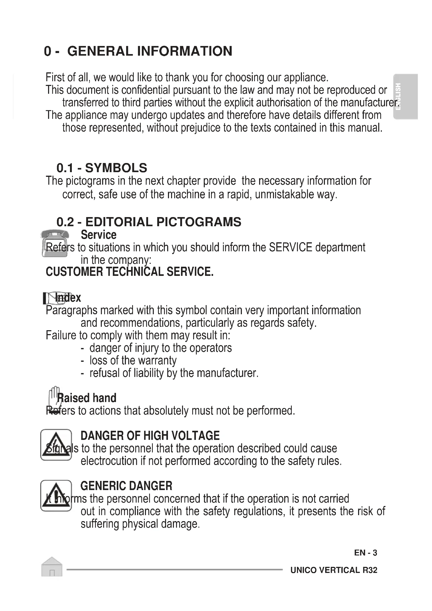 Service Refers to situations in which you should inform the SERVICE department in the company: CUSTOMER TECHNICAL SERVICE. Index Paragraphs marked with this symbol contain very important information and recommendations, particularly as regards safety. Failure to comply with them may result in: - danger of injury to the operators - loss of the warranty - refusal of liability by the manufacturer. Raised hand Refers to actions that absolutely must not be performed.