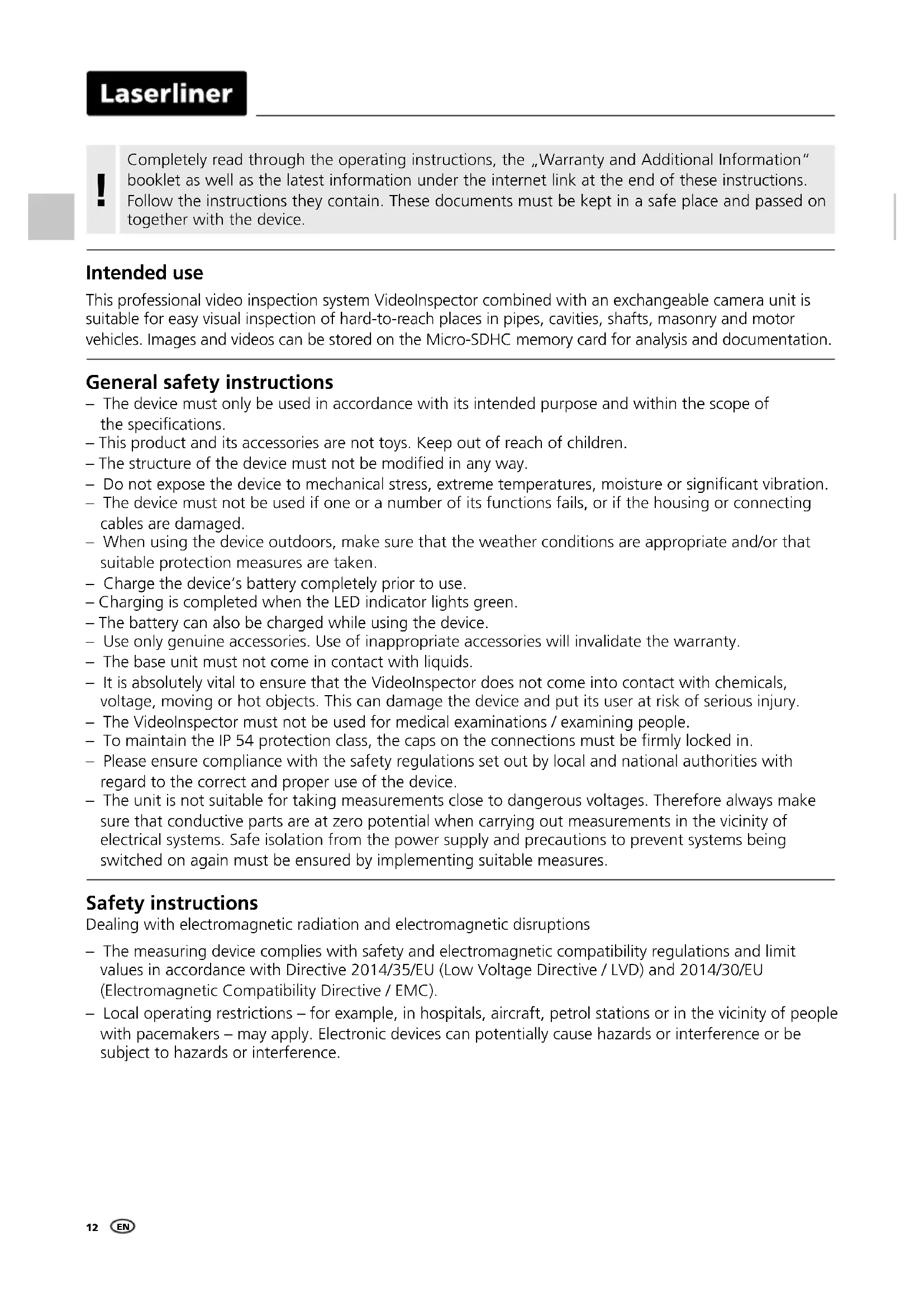 Intended use This professional video inspection system VideoInspector combined with an exchangeable camera unit is suitable for easy visual inspection of hard-to-reach places in pipes, cavities, shafts, masonry and motor vehicles. Images and videos can be stored on the Micro-SDHC memory card for analysis and documentation. Completely read through the operating instructions, the „Warranty and Additional Information“ booklet as well as the latest information under the internet link at the end of these instructions. Follow the instructions they contain. These documents must be kept in a safe place and passed on together with the device.