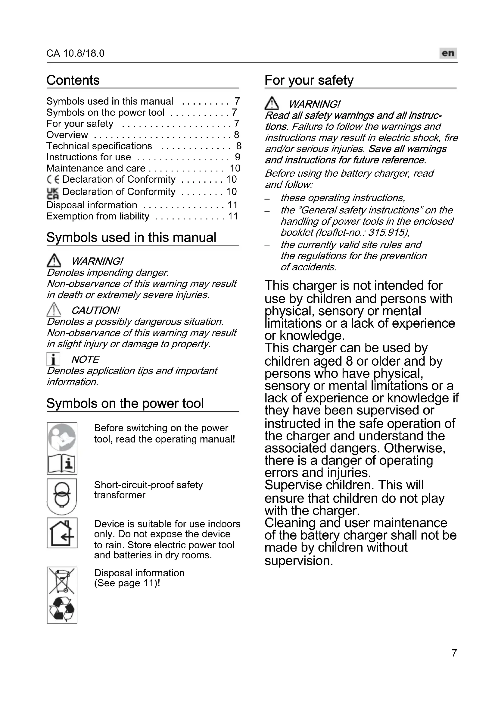 - Exemption from liability Symbols used in this manual WARNING! Denotes impending danger. Non-observance of this warning may result in death or extremely severe injuries. CAUTION! Denotes a possibly dangerous situation. Non-observance of this warning may result in slight injury or damage to property. NOTE Denotes application tips and important information. Symbols on the power tool Before switching on the power tool, read the operating manual! Short-circuit-proof safety transformer Device is suitable for use indoors only. Do not expose the device to rain. Store electric power tool and batteries in dry rooms. Disposal information (See page 11)! For your safety WARNING! Read all safety warnings and all instruc- tions. Failure to follow the warnings and instructions may result in electric shock, fire and/or serious injuries. Save all warnings and instructions for future reference. Before using the battery charger, read and follow: p. 11