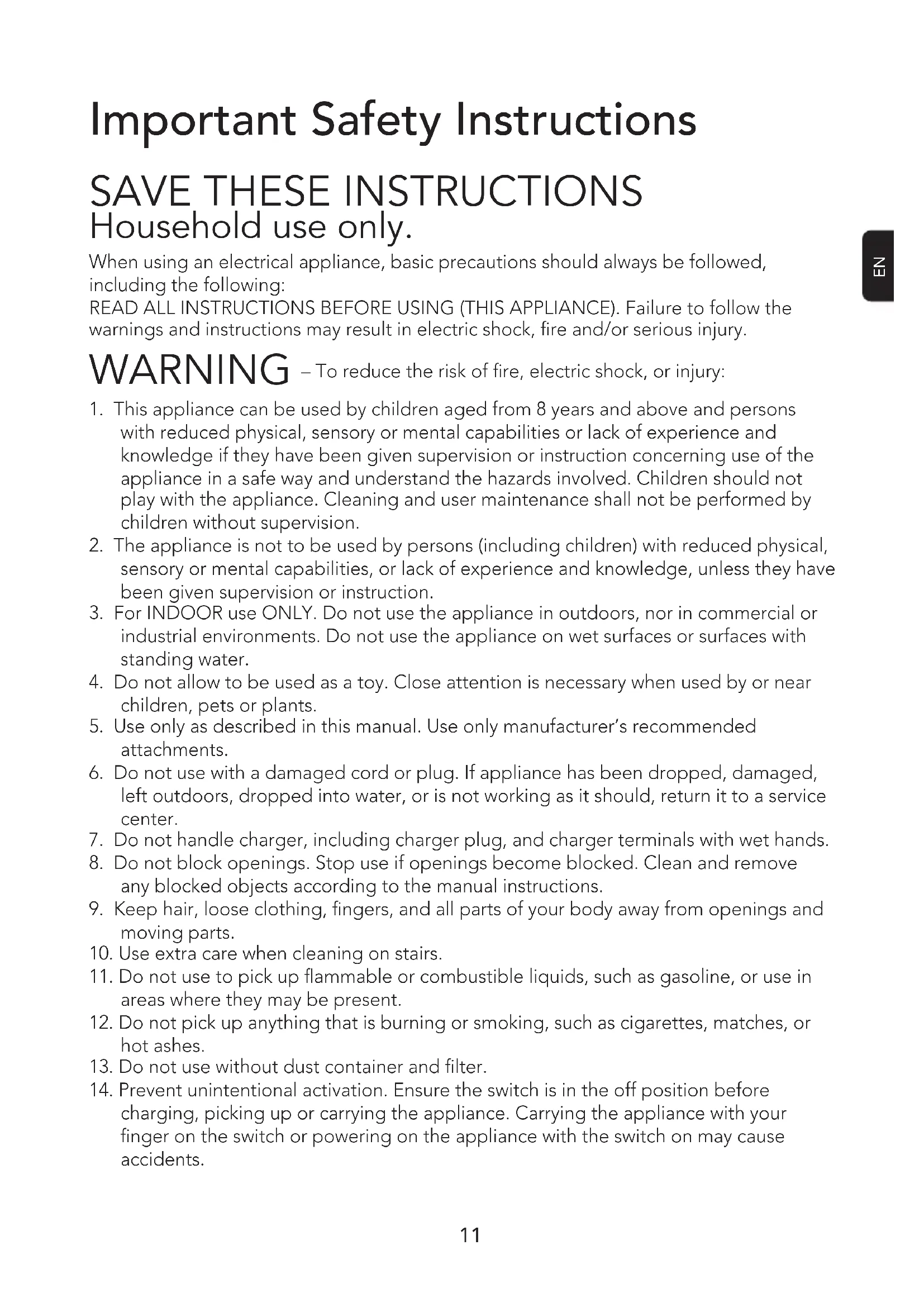 20. Follow all charging instructions and do not charge the appliance outside of