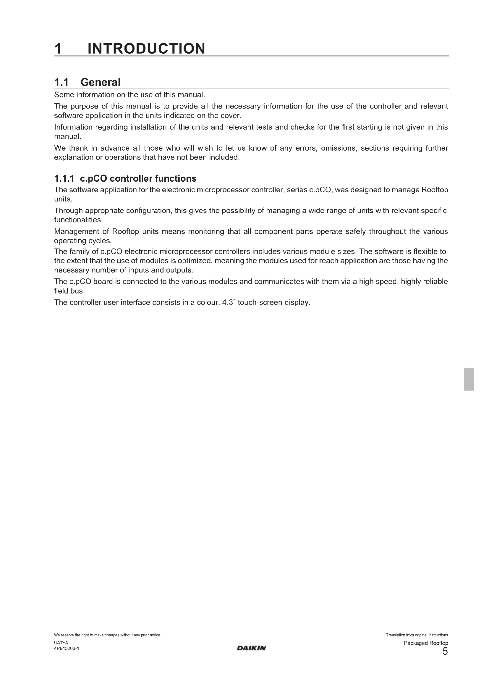 For management of the units, special software is loaded into the controller. The software consists of a combination of functions dedicated to the conditions in which the units may have to work. The following chapters describe all the functions managed by the software, ranging from ordinary functions featured in all units to functions dedicated to specic versions or models. Some of the functions described here may be available only on specic versions or sizes, or according to the selected accessories. In describing the various functions, competence in operation of the units and knowledge of the relevant hydraulic or refrigerant circuits are taken for granted. All the descriptions, settings and parameters given refer to units that are correctly installed as described in the relevant documentation.Translation from original instructionsPackaged Rooftop We reserve the right to make changes without any prior notice.UATYA4P645203-1