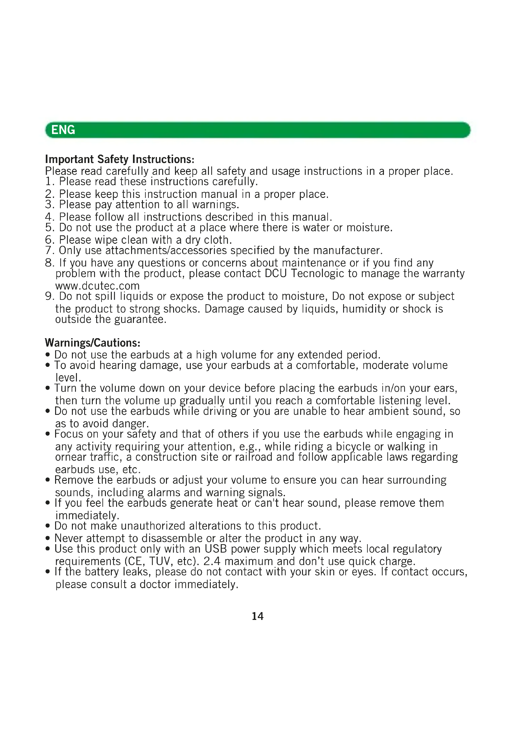 - This product contains magnetic material. Keep the product away from magnetic sensitive products (such as credit cards and video screens) to prevent damage. Listening Safety: Danger To avoid harm your hearing, do not listen at high volume for a long time. Please adjust the volume to a safe range. If the earbuds volume is too high, the use time should be shortened. After-sales Service: This product is covered under warranty for a period of 3 years free maintenance and 30-day unconditional return policies.If you have any quality problems about the product contact DCU Tecnologic at www.dcutec.com Product parameters: Bluetooth Version: V5.0/5.2 Chipset: Bluetrum 8922E Crystal-Clear calling Noise canceling: FEEDFORWARD FF Noise Reduction Depth: -25~-28dB Working Distance: 10-15m without obstacles Waterproof Rating: IPX5 Working Time: Music 8h, talk time 8h (70% volum) Charging Time: Charging case 2h, earbuds 1h Battery Capacity: 400mAH, Single earbud 50mAH Speakers: 10mm, 32Ω, S/N: ≥100dB Working Current: 7mA ENG 15Important Safety Instructions: Please read carefully and keep all safety and usage instructions in a proper place.