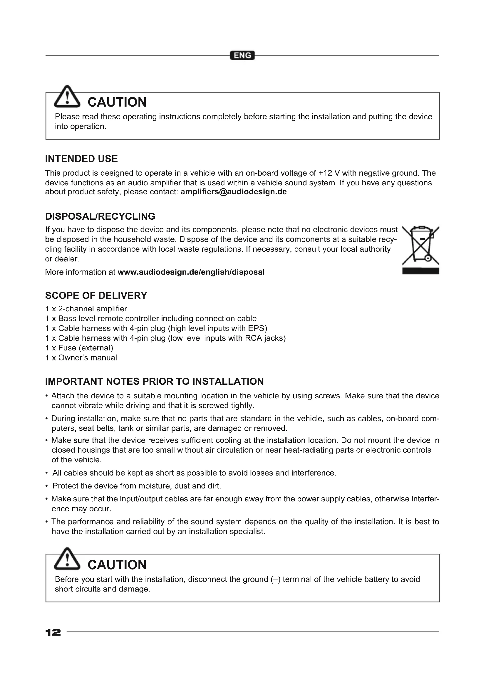 1 x 2-channel amplier 1 x Bass level remote controller including connection cable 1 x Cable harness with 4-pin plug (high level inputs with EPS) 1 x Cable harness with 4-pin plug (low level inputs with RCA jacks) 1 x Fuse (external) 1 x Owner‘s manual DISPOSAL/RECYCLING If you have to dispose the device and its components, please note that no electronic devices must be disposed in the household waste. Dispose of the device and its components at a suitable recy- cling facility in accordance with local waste regulations. If necessary, consult your local authority or dealer. More information at www.audiodesign.de/english/disposal INTENDED USE This product is designed to operate in a vehicle with an on-board voltage of +12 V with negative ground. The device functions as an audio amplier that is used within a vehicle sound system. If you have any questions about product safety, please contact: ampliers@audiodesign.de Please read these operating instructions completely before starting the installation and putting the device into operation. Before you start with the installation, disconnect the ground (–) terminal of the vehicle battery to avoid short circuits and damage. CAUTION CAUTION13