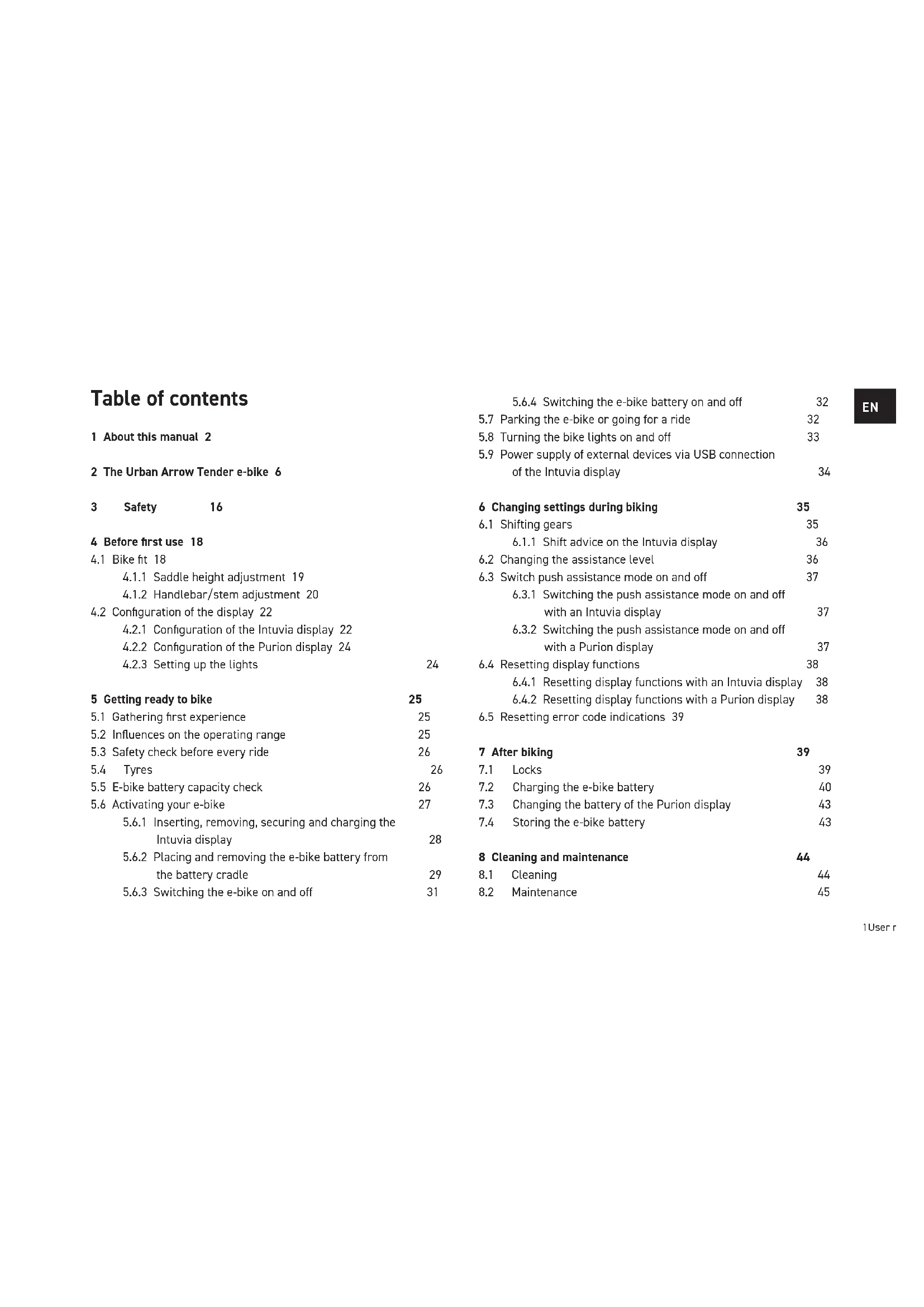 The capacity for assisting the drive has been used up and assistance is gently switched off. The remaining capacity is made available for the lighting and the display. Charge the battery (see paragraph 7.2). The battery charge-control indicator 94 or 60 flashes. The capacity for assisting the drive has been used up. The capacity of the e-bike battery is enough for about 2 hours of lighting. Charge the battery (see paragraph 7.2). Two LEDs of the charge- control indicator 44 flash. There is defect of the battery detected. Contact your Urban Arrow dealer. Three LEDs of the charge- control indicator 44 flash. The battery is not within the right charging temperature range. Disconnect the battery from the charger until its temperature has adjusted. The right charging temperature range is between 0 °C and 40 °C. The charger fails. Contact your Urban Arrow dealer.58 Urban Arrow Tender Problem Cause Solution The e-bike battery is switched off. The battery is empty. Charge the battery (see paragraph 7.2). The battery switches off after it has not been used for 10 minutes. Switch on the e-bike (see paragraph 5.6.3). Contact your Urban Arrow dealer in case the battery doesn’t switch on again or in case it switches off again after a retry. There is a hazardous situation. A protective circuit automatically switches off the battery. The battery is protected against deep discharging, overcharging, overheating and short-circuiting through the “Electronic Cell Protection" (ECP). Switch on the e-bike (see paragraph 5.6.3). Contact your Urban Arrow dealer in case the battery doesn’t switch on again or in case it switches off again after a retry. The speed is not being indicated in the speed indication 72 or 83. If the distance between speed sensor 19 and speed sensor magnet 21 is too small or too large, or if the speed sensor is not properly connected. Loosen the speed sensor magnet bolt 22 and fasten the speed sensor magnet 21 to the spoke in such a manner that it runs past the mark of the speed sensor 20 at the correct clearance (see paragraph 8.2). If the speed is still not being indicated in the speed indication 72 or 83 after this, please contact your Urban Arrow dealer. My bike can’t be switched on. The bike does not meet all requirements to be switched on. See paragraph 5.6 the check the requirements. The message ‘attach to bike appears’ on the screen of my Intuvia display. The internal battery pack of the Intuvia display is weak.