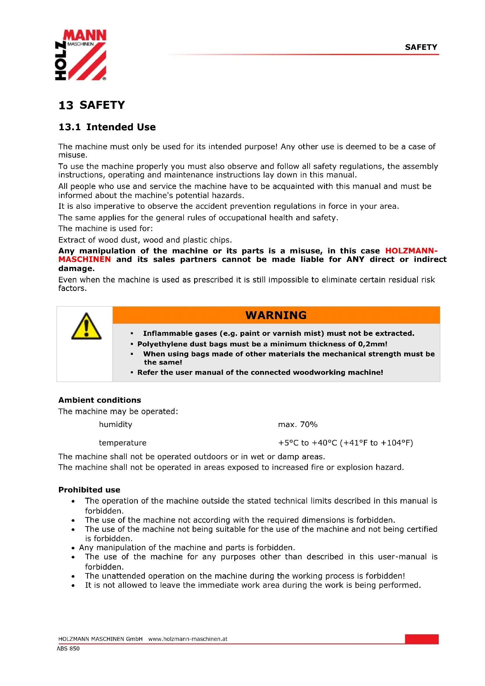 Ambient conditions The machine may be operated: humidity max. 70% temperature +5°С to +40°С (+41°F to +104°F) The machine shall not be operated outdoors or in wet or damp areas. The machine shall not be operated in areas exposed to increased fire or explosion hazard. Prohibited use The operation of the machine outside the stated technical limits described in this manual is forbidden. The use of the machine not according with the required dimensions is forbidden. The use of the machine not being suitable for the use of the machine and not being certified is forbidden. Any manipulation of the machine and parts is forbidden. The use of the machine for any purposes other than described in this user-manual is forbidden. The unattended operation on the machine during the working process is forbidden! It is not allowed to leave the immediate work area during the work is being performed.SAFETY HOLZMANN MASCHINEN GmbH www.holzmann-maschinen.at 23 ABS 850