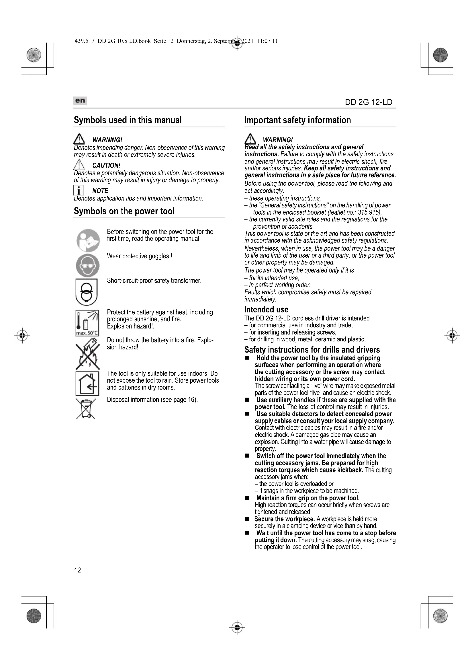 Disposal information WARNING! Render redundant power tools unusable: – mains operated power tool by removing the power cord, – battery operated power tool by removing the battery. EU countries only Do not dispose of electric power tools in the household waste! In accordance with the European Directive 2012/19/EC on Waste Electrical and Electronic Equipment and its incorporation into national law, used power tools must be collected separately and recycled in an environmentally friendly manner. Raw material recovery instead of waste disposal. Device, accessories and packaging should be recycled in an environmentally friendly manner. Plastic parts are identified for recycling according to material type. WARNING! Do not throw batteries into the household waste, fire or water. Do not open disused batteries. Batteries should be collected, recycled or disposed of in an environmentally friendly manner. EU countries only: In accordance with Directive 2006/66/EC defective or used batteries must be recycled. NOTE Please ask your dealer about disposal options. Exemption from liability The manufacturer and his representative are not liable for any damage and lost profit due to interruption in business caused by the product or by an unusable product. The manufacturer and his representative are not liable for any damage which was caused by improper use of the product or by use of the product with products from other manufacturers. 439.517_DD 2G 10.8 LD.book Seite 16 Donnerstag, 2. September 2021 11:07 11 DD 2G 12-