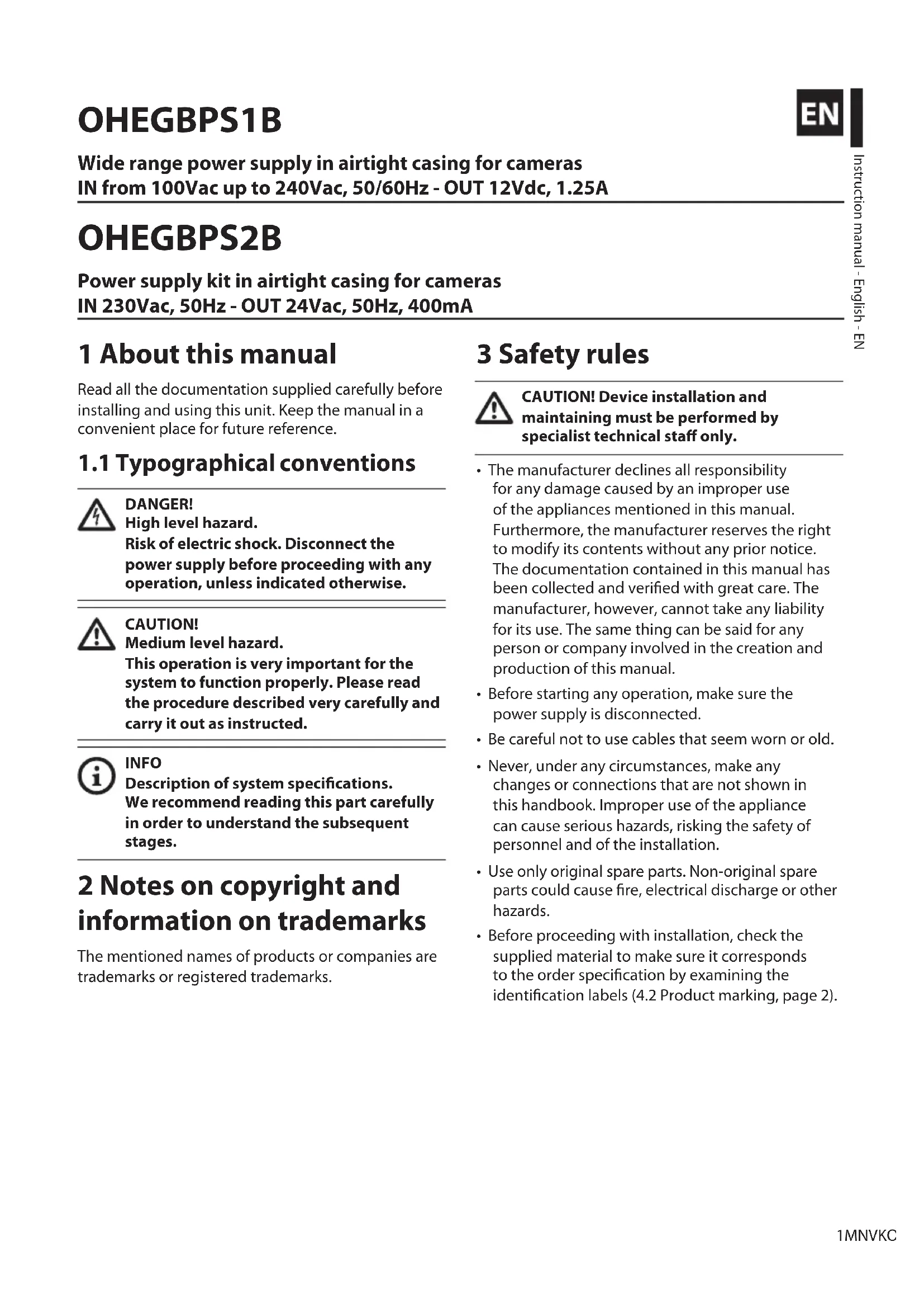 Русский - Руководство по эксплуатации OHEGBPS1B Wide range power supply in airtight casing for cameras IN from 100Vac up to 240Vac, 50/60Hz - OUT 12Vdc, 1.25A OHEGBPS2B Power supply kit in airtight casing for cameras IN 230Vac, 50Hz - OUT 24Vac, 50Hz, 400mAInstruction manual - English - EN 1MNVKOHEGB_1702_EN OHEGBPS1B Wide range power supply in airtight casing for cameras IN from 100Vac up to 240Vac, 50/60Hz - OUT 12Vdc, 1.25A OHEGBPS2B Power supply kit in airtight casing for cameras IN 230Vac, 50Hz - OUT 24Vac, 50Hz, 400mA ENGLISH 1 About this manual Read all the documentation supplied carefully before installing and using this unit. Keep the manual in a convenient place for future reference.