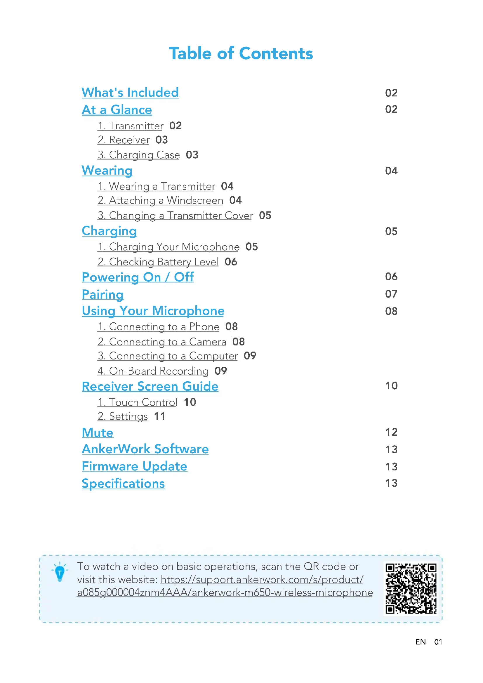 To watch a video on basic operations, scan the QR code or visit this website: https://support.ankerwork.com/s/product/ a085g000004znm4AAA/ankerwork-m650-wireless-microphone Table of ContentsEN 02 What's Included Lightning Adapter Transmitter x 2 Receiver USB-C Adapter Charging Case USB-C Cable AUX Cable (TRS) Replaceable Transmitter Cover × 2 Windscreen × 2 Travel Case At a Glance