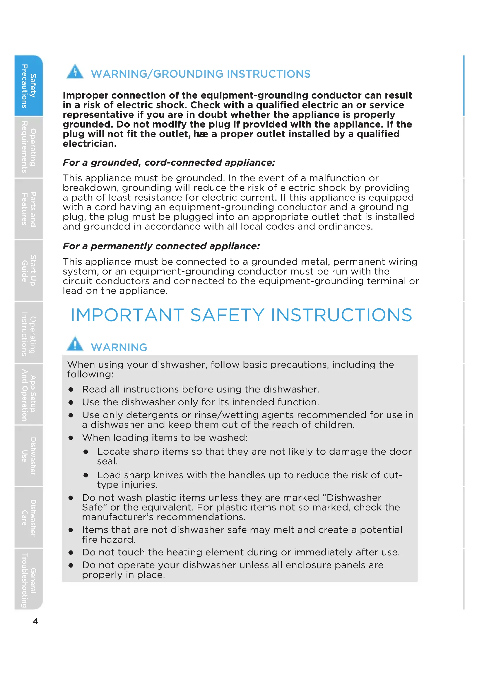 Do not operate your dishwasher unless all enclosure panels are properly in place. App Setup And Operation Operating InstructionsGeneral Troubleshooting ha5 Safety PrecautionsOperating RequirementsParts and FeaturesStart Up GuideDishwasher Use Dishwasher Care