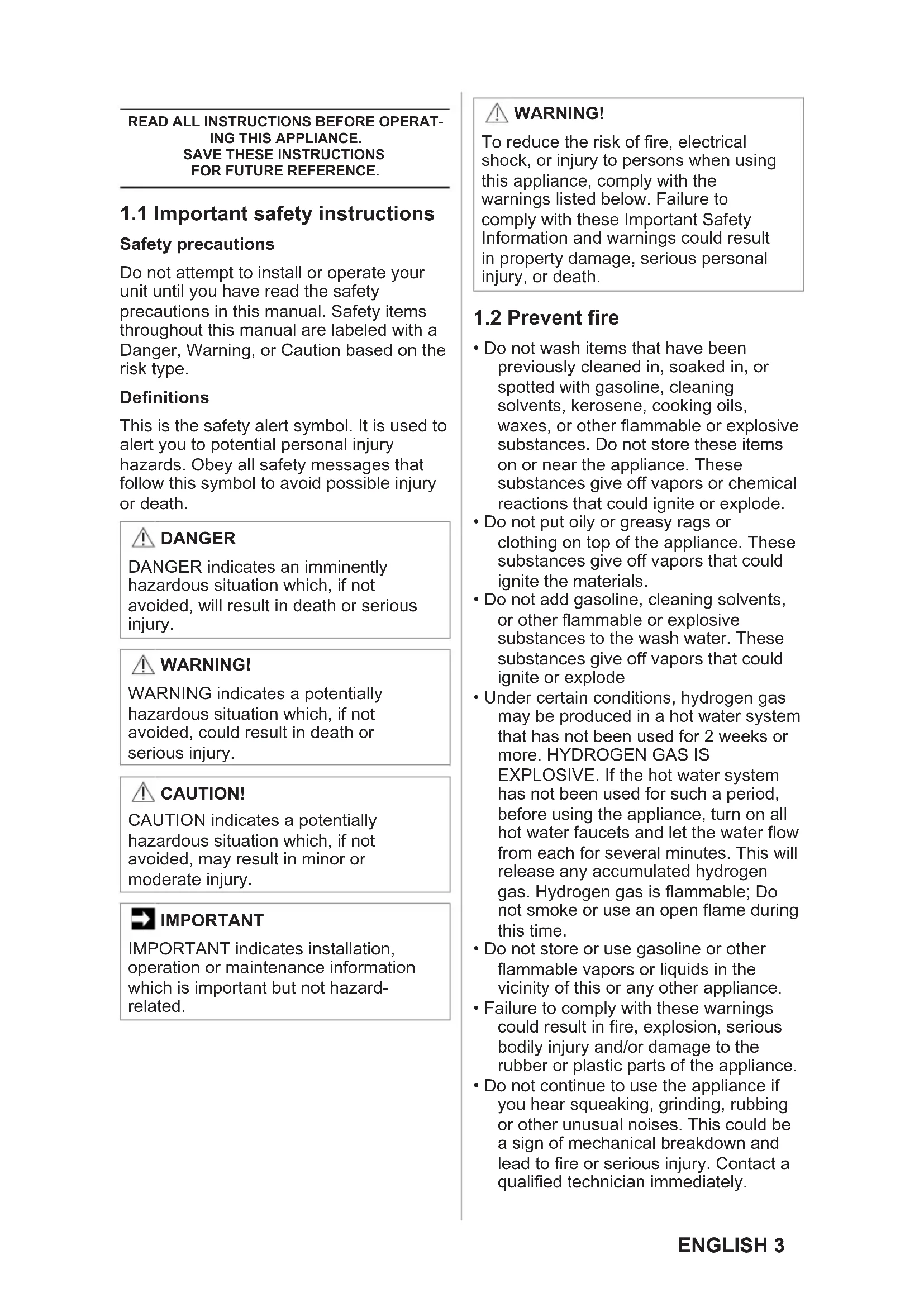 Safety precautions Do not attempt to install or operate your unit until you have read the safety precautions in this manual. Safety items throughout this manual are labeled with a Danger, Warning, or Caution based on the risk type. Definitions This is the safety alert symbol. It is used to alert you to potential personal injury hazards. Obey all safety messages that follow this symbol to avoid possible injury or death. DANGER DANGER indicates an imminently hazardous situation which, if not avoided, will result in death or serious injury. WARNING! WARNING indicates a potentially hazardous situation which, if not avoided, could result in death or serious injury. CAUTION! CAUTION indicates a potentially hazardous situation which, if not avoided, may result in minor or moderate injury. IMPORTANT IMPORTANT indicates installation, operation or maintenance information which is important but not hazard- related. WARNING! To reduce the risk of fire, electrical shock, or injury to persons when using this appliance, comply with the warnings listed below. Failure to comply with these Important Safety Information and warnings could result in property damage, serious personal injury, or death.