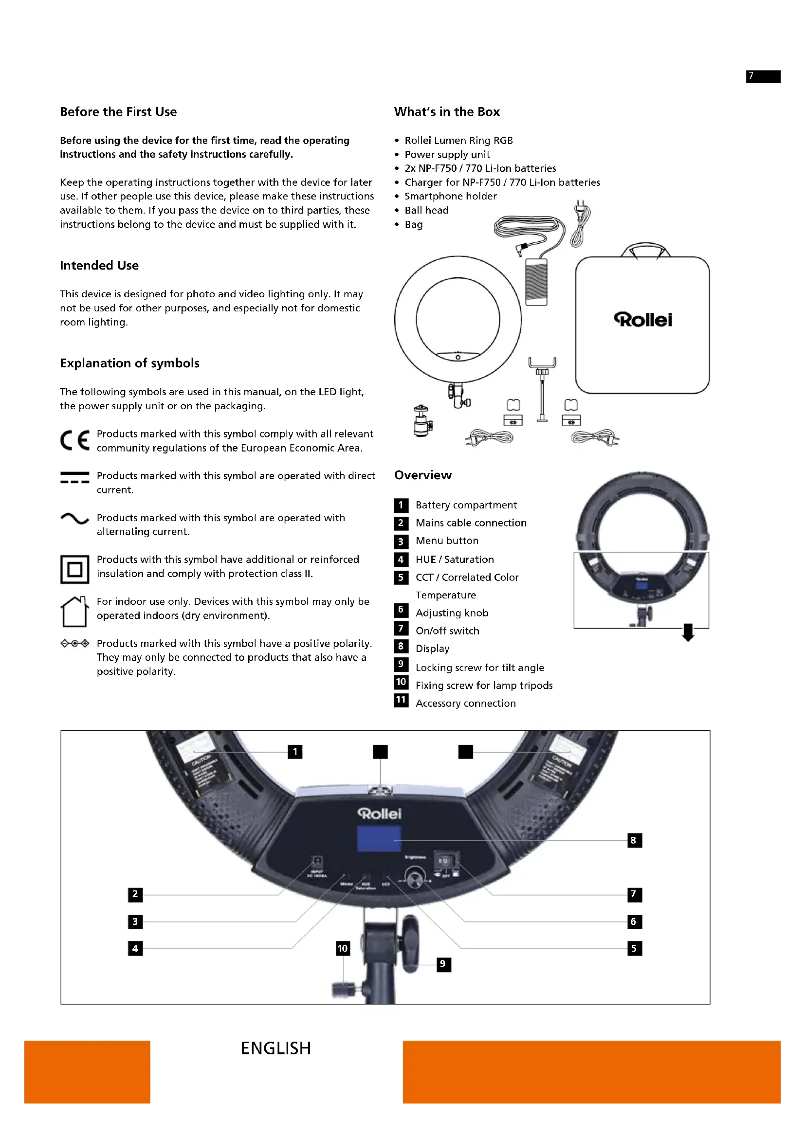 Before the First Use Before using the device for the first time, read the operating instructions and the safety instructions carefully. Keep the operating instructions together with the device for later use. If other people use this device, please make these instructions available to them. If you pass the device on to third parties, these instructions belong to the device and must be supplied with it. Intended Use This device is designed for photo and video lighting only. It may not be used for other purposes, and especially not for domestic room lighting. Explanation of symbols The following symbols are used in this manual, on the LED light, the power supply unit or on the packaging. Products marked with this symbol comply with all relevant community regulations of the European Economic Area. Products marked with this symbol are operated with direct current. Products marked with this symbol are operated with alternating current. Products with this symbol have additional or reinforced insulation and comply with protection class II. For indoor use only. Devices with this symbol may only be operated indoors (dry environment). Products marked with this symbol have a positive polarity. They may only be connected to products that also have a positive polarity. What‘s in the Box