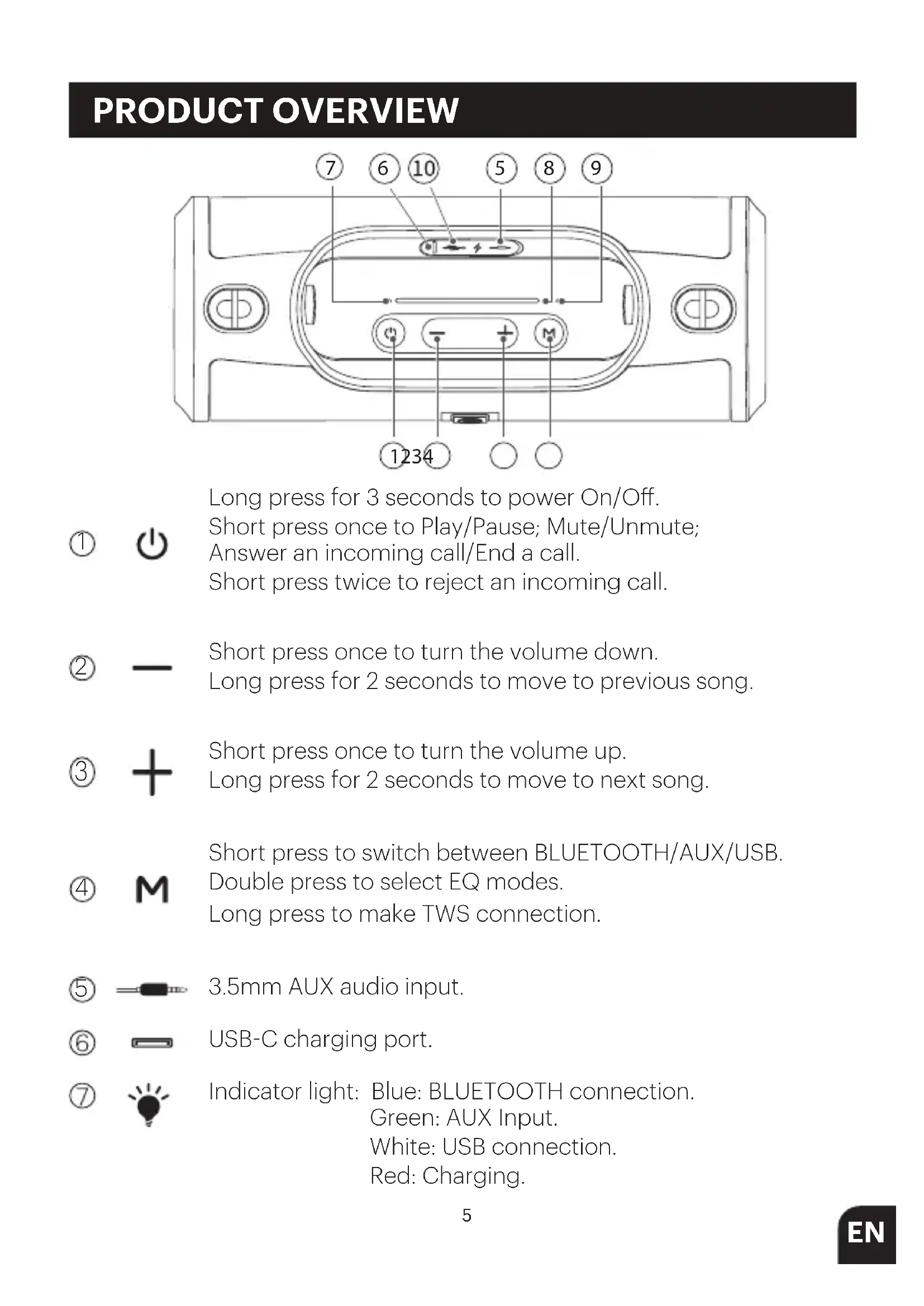 Short press to switch between BLUETOOTH/AUX/USB.Double press to select EQ modes.Long press to make TWS connection. Short press once to turn the volume up.Long press for 2 seconds to move to next song. Short press once to turn the volume down.Long press for 2 seconds to move to previous song. USB-C charging port.3.5mm AUX audio input. Indicator light: Blue: BLUETOOTH connection. Green: AUX Input. White: USB connection. Red: Charging.6