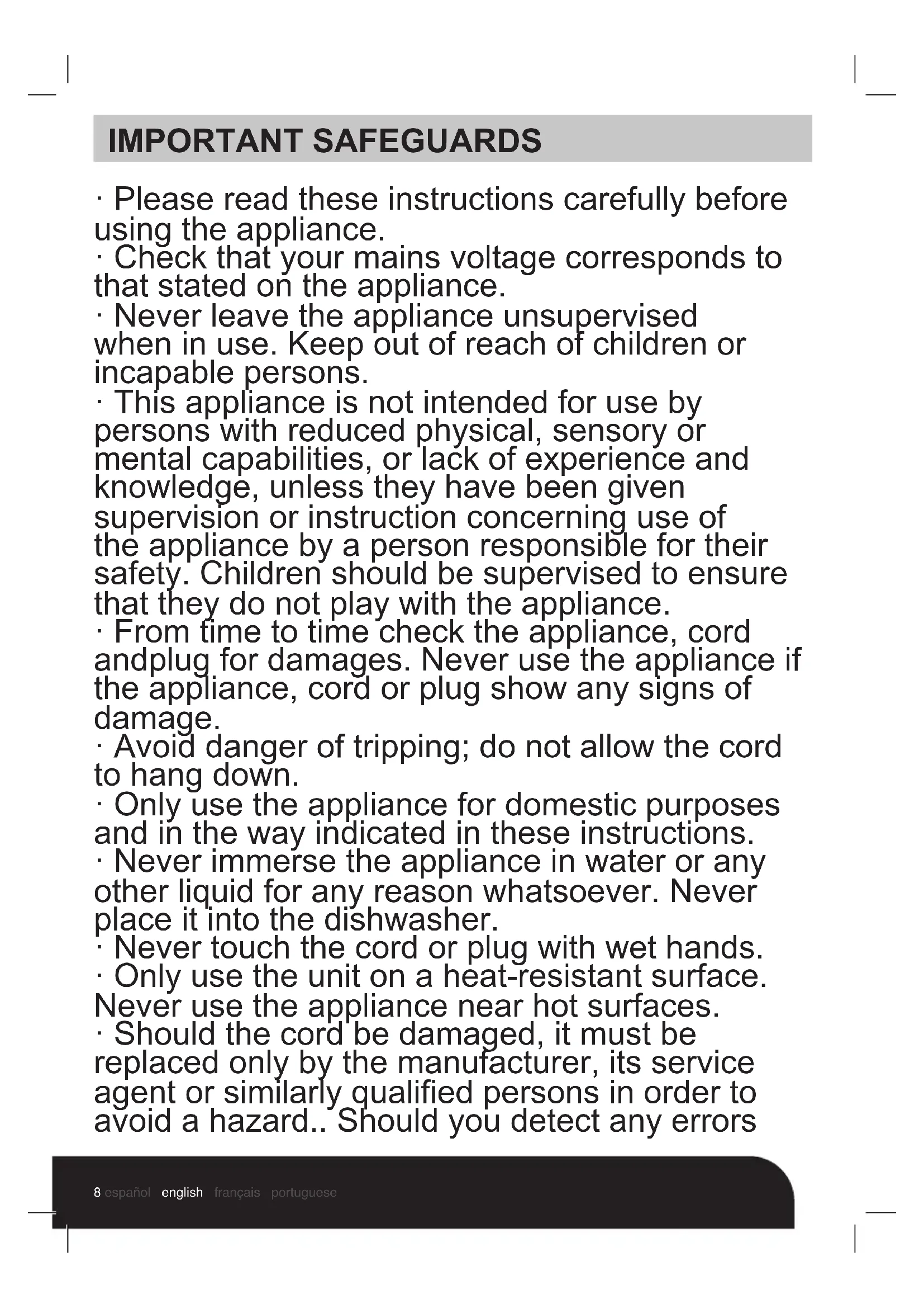 - Be careful not to scratch the special coating of the cooking plate, as you might get little pieces of this coating into the food and damage the surface. Use a classical wooden spatula or a heat resistant plastic one. - This appliance cannot be used for grilling or roasting. - This appliance can be used by children aged from 8 years and above if they have been given supervision or instruction concerning use of the appliance in a safe way and understand the hazards involved. Children shall not play with the appliance. Cleaning and user maintenance shall not be made by children unless they are older than 8 years and supervised. - This appliance shall not be used by children. Keep the appliance and its cord out of reach of11español english français portuguese children aged less than 8 years. - Do not use this appliance with a programmer, counter or another device which can automatically turn it on because if the appliance is covered or incorrectly positioned there is a danger of re.