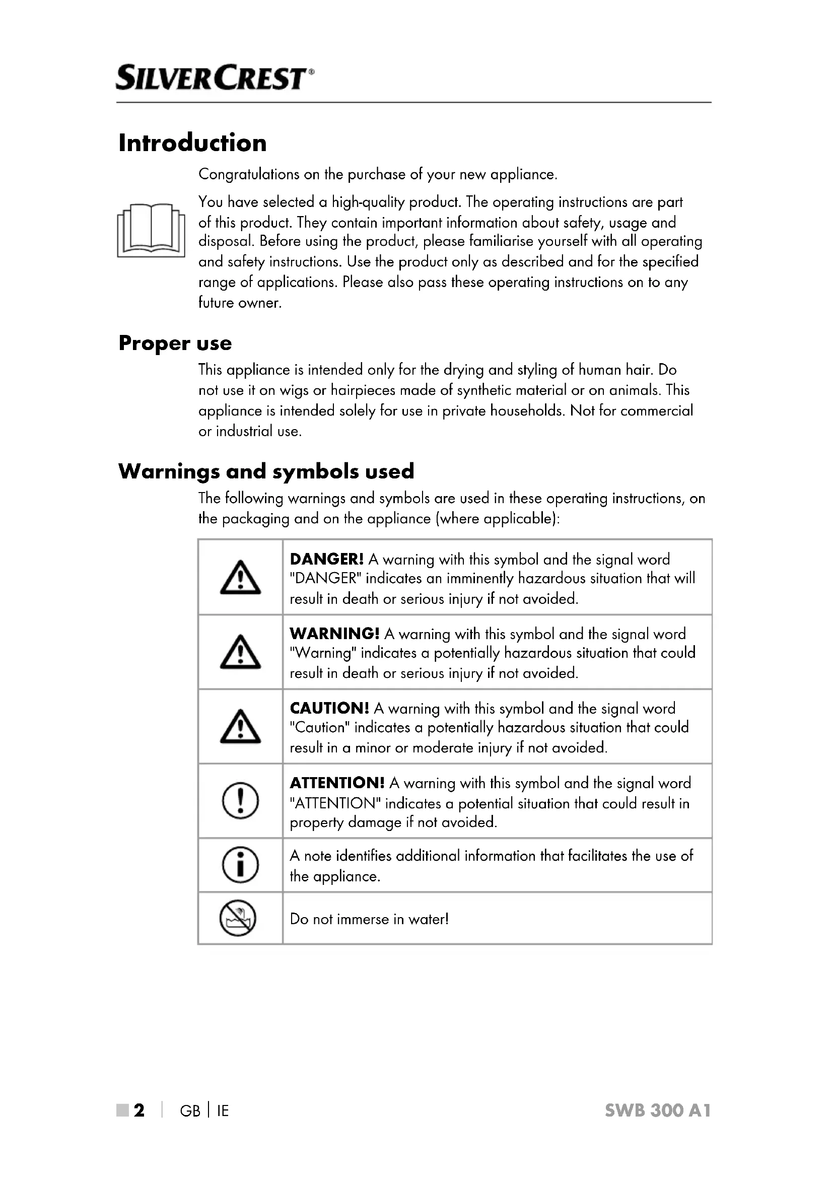 SWB 300 A1 Introduction Congratulations on the purchase of your new appliance. You have selected a high-quality product. The operating instructions are part of this product. They contain important information about safety, usage and disposal. Before using the product, please familiarise yourself with all operating and safety instructions. Use the product only as described and for the specified range of applications. Please also pass these operating instructions on to any future owner. Proper use This appliance is intended only for the drying and styling of human hair. Do not use it on wigs or hairpieces made of synthetic material or on animals. This appliance is intended solely for use in private households. Not for commercial or industrial use. Warnings and symbols used The following warnings and symbols are used in these operating instructions, on the packaging and on the appliance (where applicable): DANGER! A warning with this symbol and the signal word "DANGER" indicates an imminently hazardous situation that will result in death or serious injury if not avoided. WARNING! A warning with this symbol and the signal word "Warning" indicates a potentially hazardous situation that could result in death or serious injury if not avoided. CAUTION! A warning with this symbol and the signal word "Caution" indicates a potentially hazardous situation that could result in a minor or moderate injury if not avoided. ATTENTION! A warning with this symbol and the signal word "ATTENTION" indicates a potential situation that could result in property damage if not avoided. A note identifies additional information that facilitates the use of the appliance. Do not immerse in water!GB