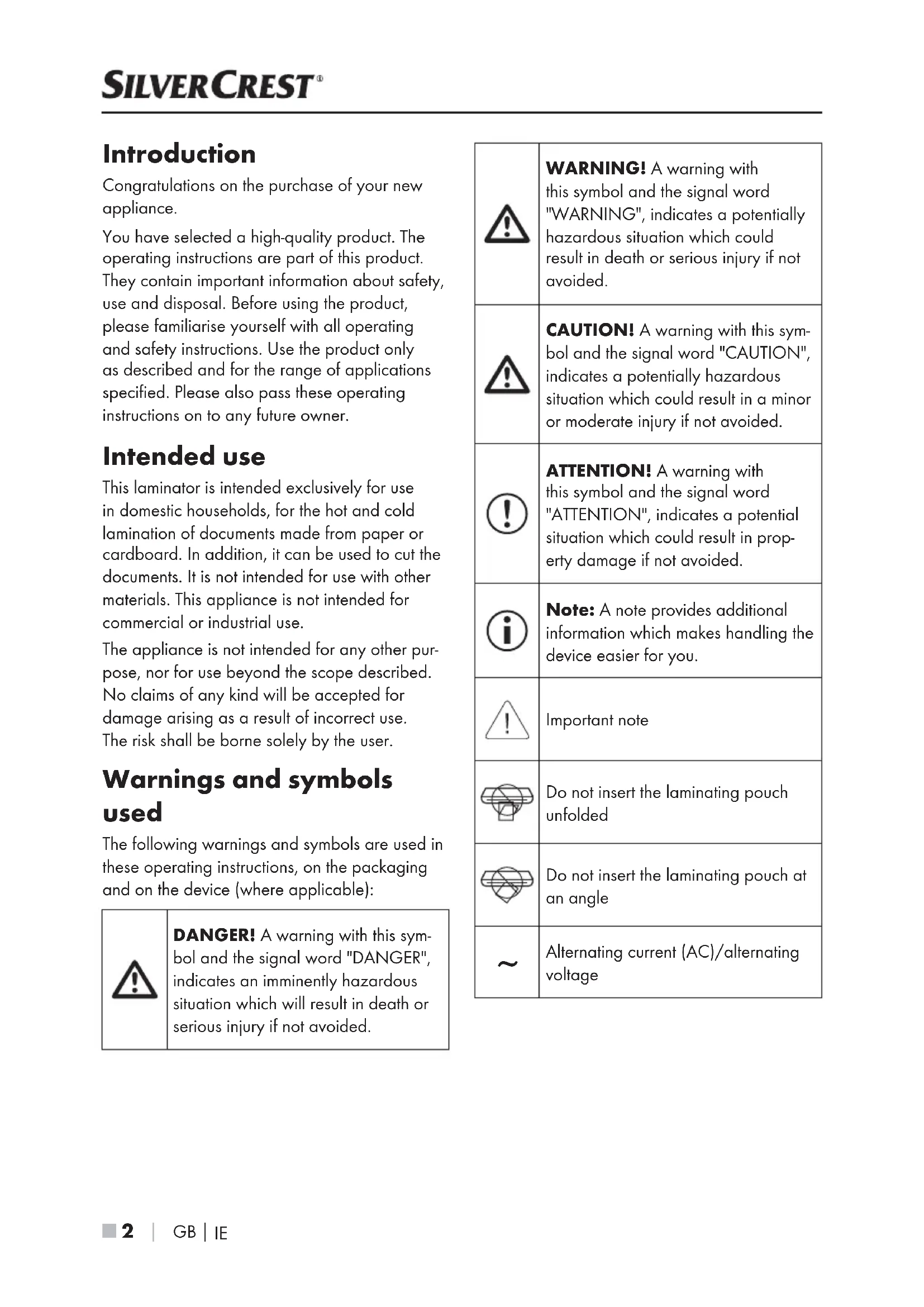Introduction Congratulations on the purchase of your new appliance. You have selected a high-quality product. The operating instructions are part of this product. They contain important information about safety, use and disposal. Before using the product, please familiarise yourself with all operating and safety instructions. Use the product only as described and for the range of applications specified. Please also pass these operating instructions on to any future owner. Intended use This laminator is intended exclusively for use in domestic households, for the hot and cold lamination of documents made from paper or cardboard. In addition, it can be used to cut the documents. It is not intended for use with other materials. This appliance is not intended for commercial or industrial use. The appliance is not intended for any other pur- pose, nor for use beyond the scope described. No claims of any kind will be accepted for damage arising as a result of incorrect use. The risk shall be borne solely by the user. Warnings and symbols used The following warnings and symbols are used in these operating instructions, on the packaging and on the device (where applicable): DANGER! A warning with this sym- bol and the signal word "DANGER", indicates an imminently hazardous situation which will result in death or serious injury if not avoided. WARNING! A warning with this symbol and the signal word "WARNING", indicates a potentially hazardous situation which could result in death or serious injury if not avoided. CAUTION! A warning with this sym- bol and the signal word "CAUTION", indicates a potentially hazardous situation which could result in a minor or moderate injury if not avoided. ATTENTION! A warning with this symbol and the signal word "ATTENTION", indicates a potential situation which could result in prop- erty damage if not avoided. Note: A note provides additional information which makes handling the device easier for you. Important note Do not insert the laminating pouch unfolded Do not insert the laminating pouch at an angle