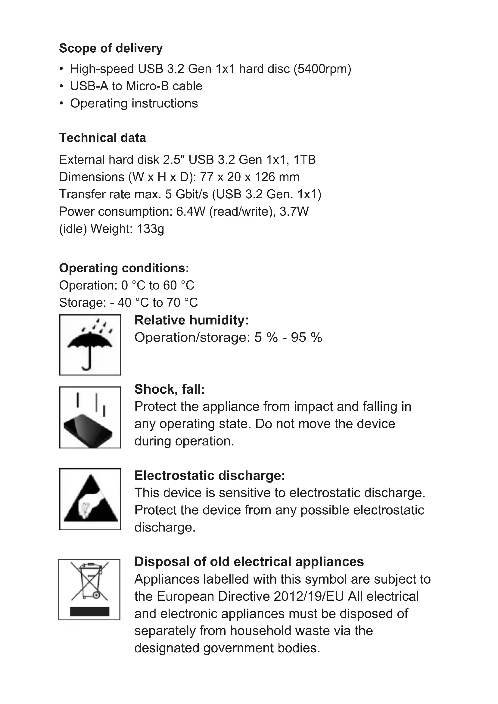 Operating instructions Technical data External hard disk 2.5" USB 3.2 Gen 1x1, 1TB Dimensions (W x H x D): 77 x 20 x 126 mm Transfer rate max. 5 Gbit/s (USB 3.2 Gen. 1x1) Power consumption: 6.4W (read/write), 3.7W (idle) Weight: 133g Operating conditions: Operation: 0 °C to 60 °C Storage: - 40 °C to 70 °C Relative humidity: Operation/storage: 5 % - 95 % Shock, fall: Protect the appliance from impact and falling in any operating state. Do not move the device during operation. Electrostatic discharge: This device is sensitive to electrostatic discharge. Protect the device from any possible electrostatic discharge. Disposal of old electrical appliances Appliances labelled with this symbol are subject to the European Directive 2012/19/EU All electrical and electronic appliances must be disposed of separately from household waste via the designated government bodies.FR