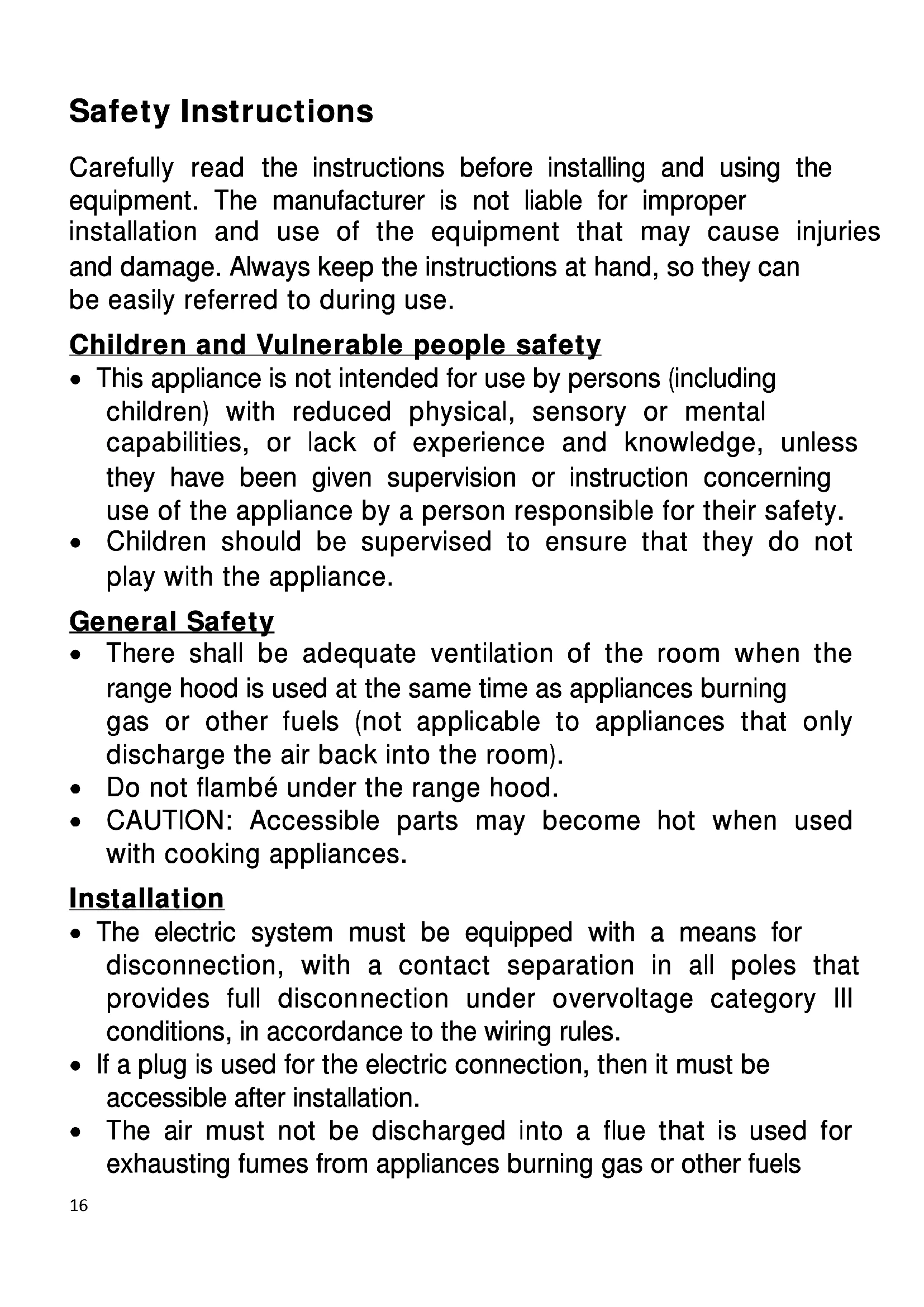 Eliminación del embalaje El embalaje está marcado con el Punto Verde. Para eliminar todos los materiales de embalaje, como el cartón, poliuretano y las películas, utilice contenedores adecuados. Así se garantiza la reutilización de los materiales de embalaje. Eliminación de aparatos fuera de uso En base a la Norma europea 2012/19/UE de Residuos de Aparatos Eléctricos y Electrónicos (RAEE), los electrodomésticos viejos no pueden ser arrojados en los contenedores municipales habituales; tienen que ser recogidos selectivamente para optimizar la recuperación y reciclado de los componentes y materiales que los constituyen, y reducir el impacto en la salud humana y el medioambiente. El símbolo del cubo de basura tachado se marca sobre todos los productos para recordar al consumidor la obligación de separarlos para la recogida selectiva. El consumidor debe contactar con la autoridad local o con el vendedor para informarse en relación a la correcta eliminación de su electrodoméstico viejo. Antes de eliminar su aparato, inutilícelo. Tire el cable de alimentación, córtelo y elimínelo.16 Safety Instructions Carefully read the instructions before installing and using the equipment. The manufacturer is not liable for improper installation and use of the equipment that may cause injuries and damage. Always keep the instructions at hand, so they can be easily referred to during use. Children and Vulnerable people safety This appliance is not intended for use by persons (including children) with reduced physical, sensory or mental capabilities, or lack of experience and knowledge, unless they have been given supervision or instruction concerning use of the appliance by a person responsible for their safety. Children should be supervised to ensure that they do not play with the appliance. General Safety There shall be adequate ventilation of the room when the range hood is used at the same time as appliances burning gas or other fuels (not applicable to appliances that only discharge the air back into the room). Do not flambé under the range hood. CAUTION: Accessible parts may become hot when used with cooking appliances. Installation The electric system must be equipped with a means for disconnection, with a contact separation in all poles that provides full disconnection under overvoltage category III conditions, in accordance to the wiring rules. If a plug is used for the electric connection, then it must be accessible after installation. The air must not be discharged into a flue that is used for exhausting fumes from appliances burning gas or other fuels17 english (not applicable to appliances that only discharge the air back into the room). The lower part of the extractor must be located at a minimum height of 60 cm above the hob for electric cookers and 65 cm for gas cookers. If the instructions of a gas cooker indicate a greater distance these must be observed. Before installing the extractor consult the local rules and regulations in force with respect to the discharge of air and fumes. When the extractor is working at the same time as other non-electrical cooking equipment, the outlet air pressure must not exceed 4 Pa (4x10-5 bar). Before connecting the extractor to the mains, check that both the voltage and the frequency conform to that shown on the characteristics label located inside the extractor. To achieve optimum performance the length of the outlet hose should not exceed 4 meters, or include more than two 90º angles (elbows). Although venting to the outside is recommended, activated carbon filter may be used to allow the gas to be returned to the kitchen through the outlet pipe. NOTE: For more Installation information, refer to the end of this user manual. Cleaning There is a fire risk if cleaning is not carried out in accordance with the instructions. Do not allow grease to accumulate in any part of the extractor, especially in the grease filters as this COULD PRODUCE A FIRE RISK! The grease filters and the internal part of the extractor must be cleaned at least once a month depending on how often18 the extractor is used. Note that grease is deposited in the extractor when cooking, whether it is switched on or not. We recommend the use of gloves and caution when cleaning the inside of the extractor. Repairs If the supply cord is damaged, it must be replaced by the manufacturer, its service agent or similarly qualified persons in order to avoid a hazard. Do not switch on the extractor if the supply cord is worn or has cuts or if there are signs of deterioration around the control panel. If the LED module is malfunctioning, it must be replaced by the manufacturer, its service agent or similarly qualified persons in order to avoid a hazard. If the extractor stops working or functions abnormally, unplug it from the mains and contact the technical service.