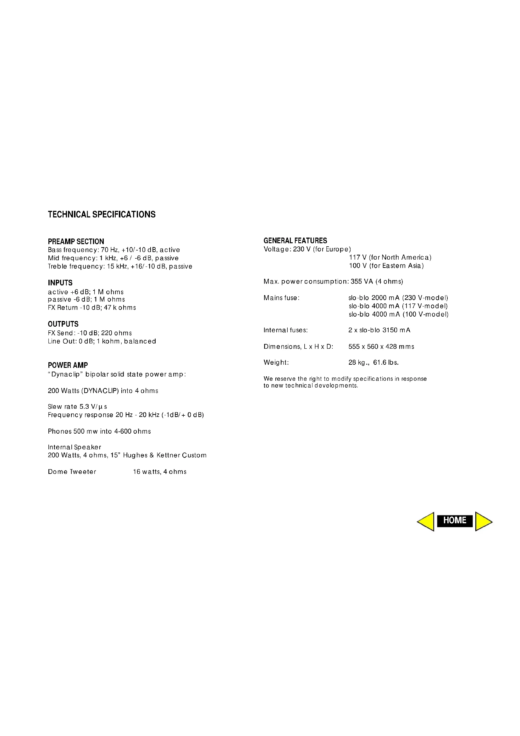 Voltage: 230 V (for Europe) 117 V (for North America) 100 V (for Eastern Asia) Max. power consumption: 355 VA (4 ohms) Mains fuse: slo-blo 2000 mA (230 V-model) slo-blo 4000 mA (117 V-model) slo-blo 4000 mA (100 V-model) Internal fuses: 2 x slo-blo 3150 mA Dimensions, L x H x D: 555 x 560 x 428 mms Weight: 28 kg., 61.6 lbs. We reserve the right to modify specifications in response to new technical developments.