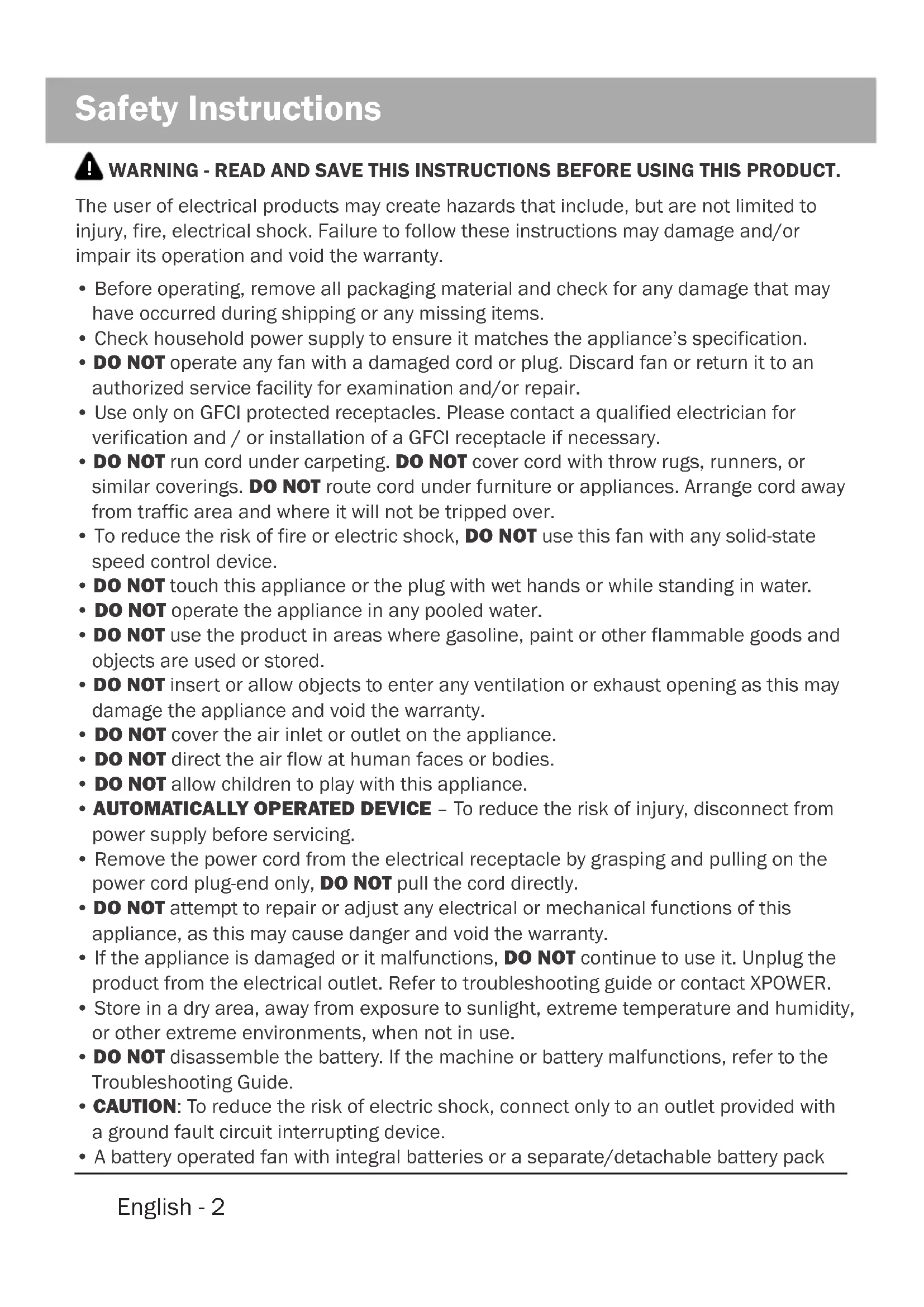 XPOWER-branded products purchased in the U.S. from authorized distributors include a 1-year limited warranty. Contact XPOWER to confirm warranty information about your product(s). This limited warranty covers defects in materials and workmanship in your XPOWER- branded products, purchased in the U.S. ONLY. Local warranty policy (if any) in your country will cover products purchased outside the U.S. Items mentioned but not limited to below are not covered by warranty: (1) Power cord, filters or any other components considered as a “consumable parts” by XPOWER. (2) Normal wear and tear. (3) Problems that result, directly or indirectly, at XPOWER’s sole discretion, from: (3.1) External causes such as accident, abuse, misuse or problems with electrical power supply. (3.2) Disassembling, servicing or modification not authorized by XPOWER. (3.3) Usage that is not accordant with product instructions stated in Owner’s Manual. (3.4) Failure to follow the product instructions or lack of necessary maintenance stated in Owner’s Manual. Before contacting XPOWER, please try one or more of the following: (1) Consult this Owner’s Manual and follow the instructions of troubleshooting guide. (2) Access www.xpower.com for more advice and information that could be helpful to address your problems. If you need additional assistance from XPOWER, please: (1) Email info@xpower.com. (2) Call XPOWER U.S. Customer Service Department at 855-855-8868 or other numbers provided on www.xpower.com. (3) Visit XPOWER U.S. Head Office at 668 S. 6th Ave., City of Industry, CA 91746 or the most current address provided on www.xpower.com. Please also have your original proof of purchase and the serial number(s) of your product(s) ready when you contact XPOWER. IMPORTANT: (1) Please finish the online warranty registration before usage. Visit https://xpower. com/warranty-registration/ (2) This Limited Warranty applies with its own timeliness. Contact XPOWER or visit www.xpower.com for more information. !English - 13 If you are instructed to return the unit for service or replacement, please: (1) Request a RMA (Return-Merchandise-Authorization) number. (2) Use the original or an equivalent packaging, prepay shipping charges at your own expense to the address provided by XPOWER, with the RMA number on the shipping label or the packaging. (3) Include all the original parts and components. XPOWER will inspect, assess and advise the repairs needed and applicable cost, if any. For products under warranty, we will pay to ship the repaired or replaced product(s) to you if you use an address within the Contiguous United States. Otherwise, we will ship the product(s) to you at your own expense. XPOWER Limited Warranty (USA)Español - 2 Instrucciones de seguridad