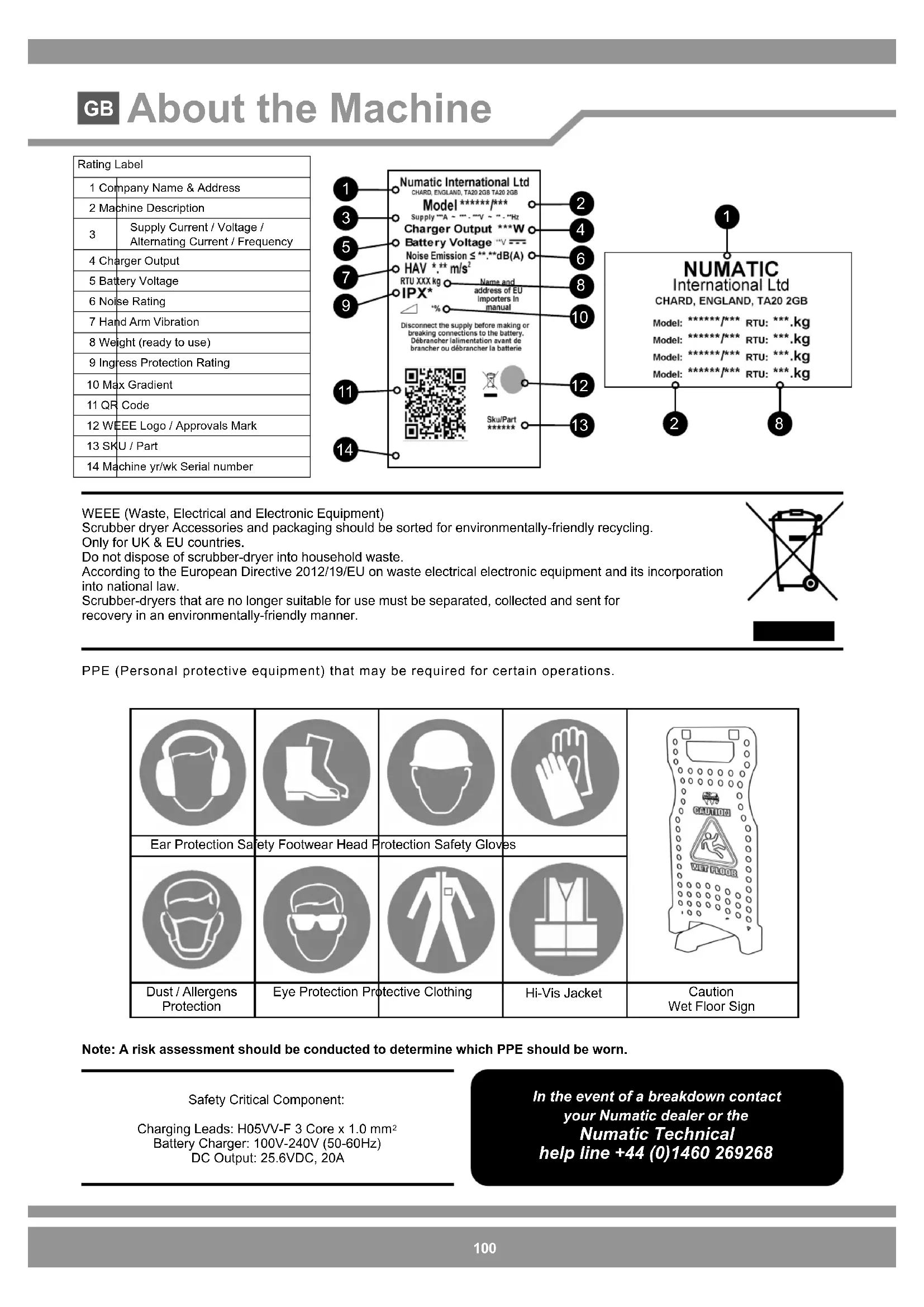 Fejlstatus for statuslampe/grønt lys for trækkraft (Side 13-15)100100 Ear Protection Safety Footwear Head Protection Safety GlovesDust / AllergensProtectionEye Protection Protective ClothingHi-Vis JacketCaution Wet Floor SignPPE (Personal protective equipment) that may be required for certain operations.WEEE (Waste, Electrical and Electronic Equipment)Scrubber dryer Accessories and packaging should be sorted for environmentally-friendly recycling.Only for UK & EU countries.Do not dispose of scrubber-dryer into household waste.According to the European Directive 2012/19/EU on waste electrical electronic equipment and its incorporation into national law.Scrubber-dryers that are no longer suitable for use must be separated, collected and sent for recovery in an environmentally-friendly manner.Note: A risk assessment should be conducted to determine which PPE should be worn.Safety Critical Component:Charging Leads: H05VV-F 3 Core x 1.0 mm Battery Charger: 100V-240V (50-60Hz)DC Output: 25.6VDC, 20A In the event of a breakdown contact your Numatic dealer or the Numatic Technical help line +44 (0)1460 269268