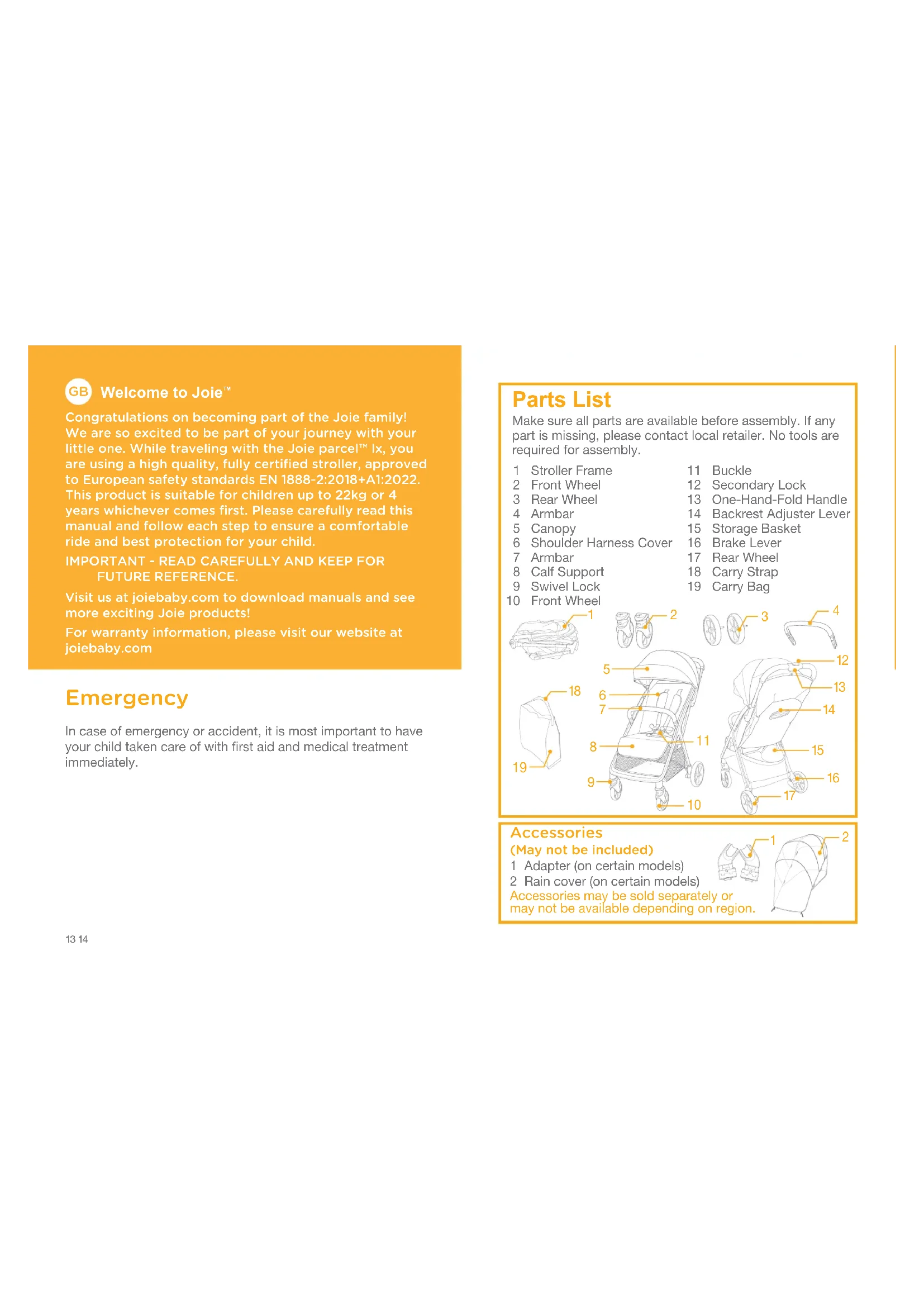 Congratulations on becoming part of the Joie family! We are so excited to be part of your journey with your little one. While traveling with the Joie parcel™ lx, you are using a high quality, fully certified stroller, approved to European safety standards EN 1888-2:2018+A1:2022. This product is suitable for children up to 22kg or 4 years whichever comes first. Please carefully read this manual and follow each step to ensure a comfortable ride and best protection for your child.IMPORTANT - READ CAREFULLY AND KEEP FOR FUTURE REFERENCE.Visit us at joiebaby.com to download manuals and see more exciting Joie products!For warranty information, please visit our website at joiebaby.com 1 Stroller Frame 2 Front Wheel 3 Rear Wheel 4 Armbar 5 Canopy 6 Shoulder Harness Cover 7 Armbar 8 Calf Support 9 Swivel Lock10 Front Wheel11 Buckle12 Secondary Lock13 One-Hand-Fold Handle14 Backrest Adjuster Lever15 Storage Basket16 Brake Lever17 Rear Wheel18 Carry Strap 19 Carry Bag Accessories (May not be included)1 Adapter (on certain models)2 Rain cover (on certain models)Accessories may be sold separately or may not be available depending on region. Parts List Make sure all parts are available before assembly. If any part is missing, please contact local retailer. No tools are required for assembly.