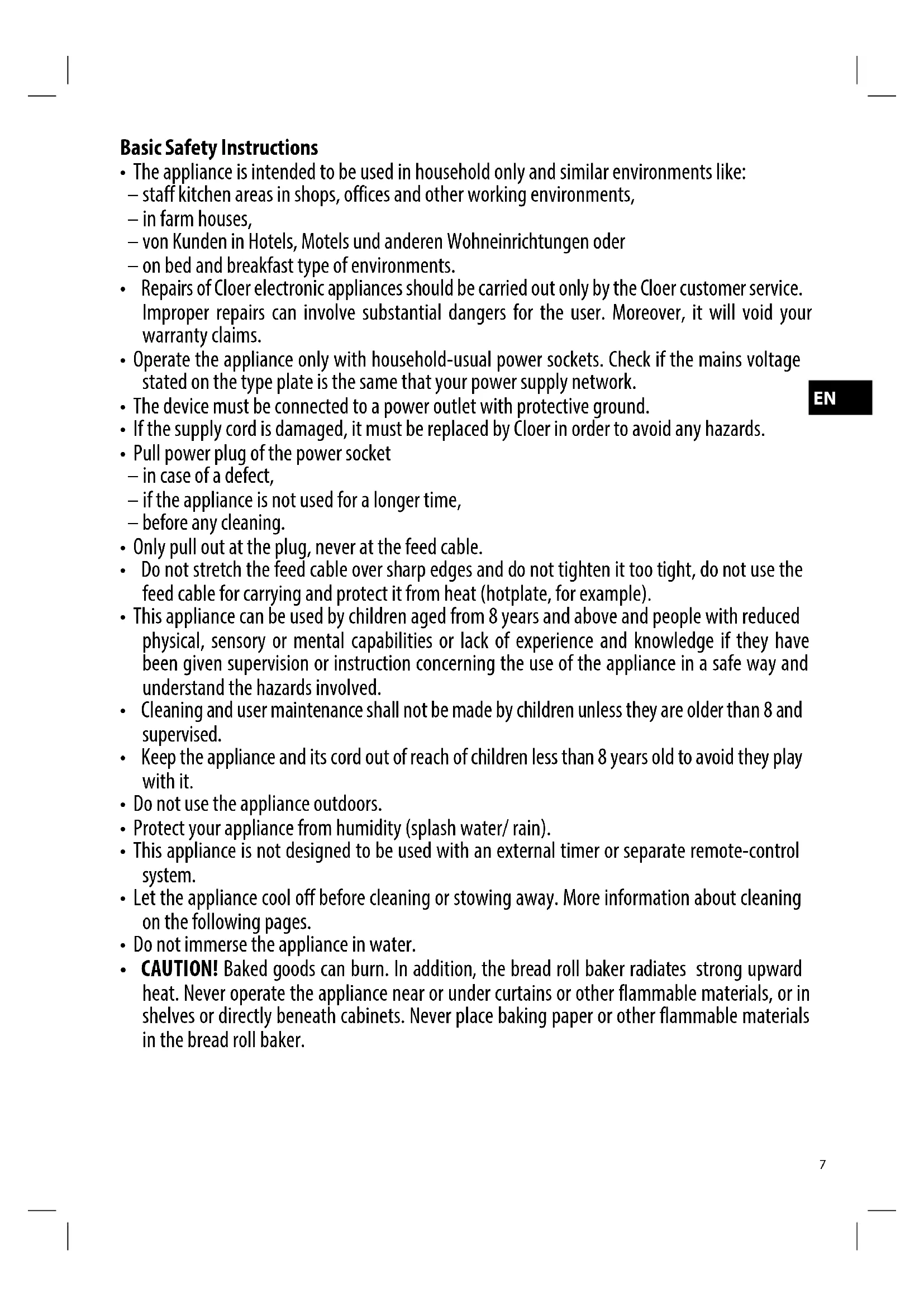 - CAUTION! Baked goods can burn. In addition, the bread roll baker radiates strong upward heat. Never operate the appliance near or under curtains or other flammable materials, or in shelves or directly beneath cabinets. Never place baking paper or other flammable materials in the bread roll baker.8