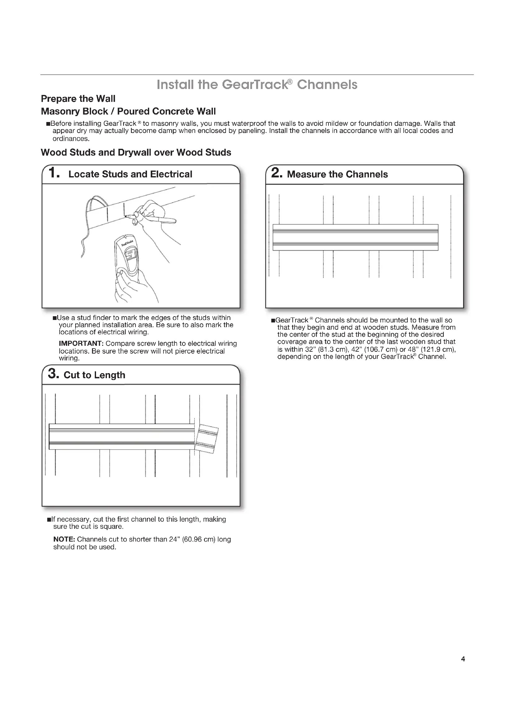 Channels Prepare the Wall Masonry Block / Poured Concrete Wall ■ Before installing GearTrack to masonry walls, you must waterproof the walls to avoid mildew or foundation damage. Walls that appear dry may actually become damp when enclosed by paneling. Install the channels in accordance with all local codes and ordinances. Wood Studs and Drywall over Wood Studs ■ Use a stud nder to mark the edges of the studs within your planned installation area. Be sure to also mark the locations of electrical wiring.IMPORTANT: Compare screw length to electrical wiring locations. Be sure the screw will not pierce electrical wiring. Stud Finder