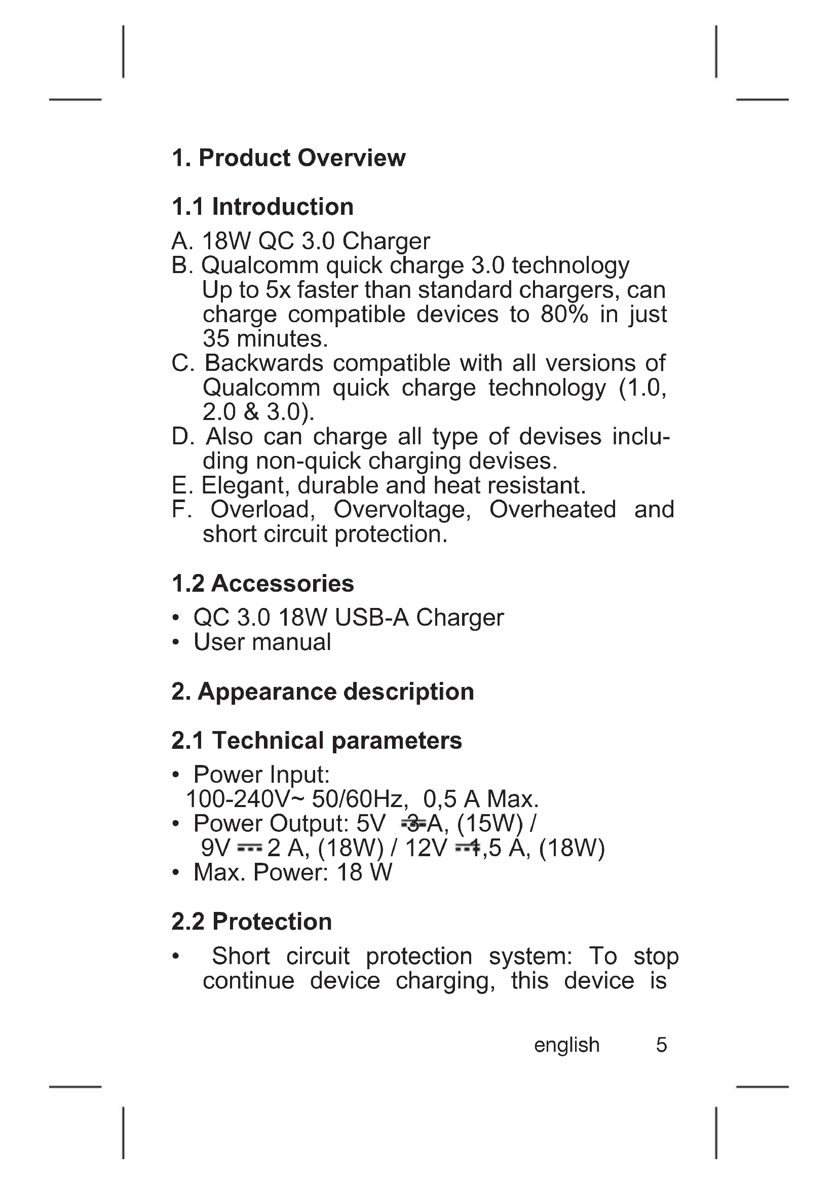 D. Also can charge all type of devises inclu- ding non-quick charging devises. E. Elegant, durable and heat resistant. F. Overload, Overvoltage, Overheated and short circuit protection.