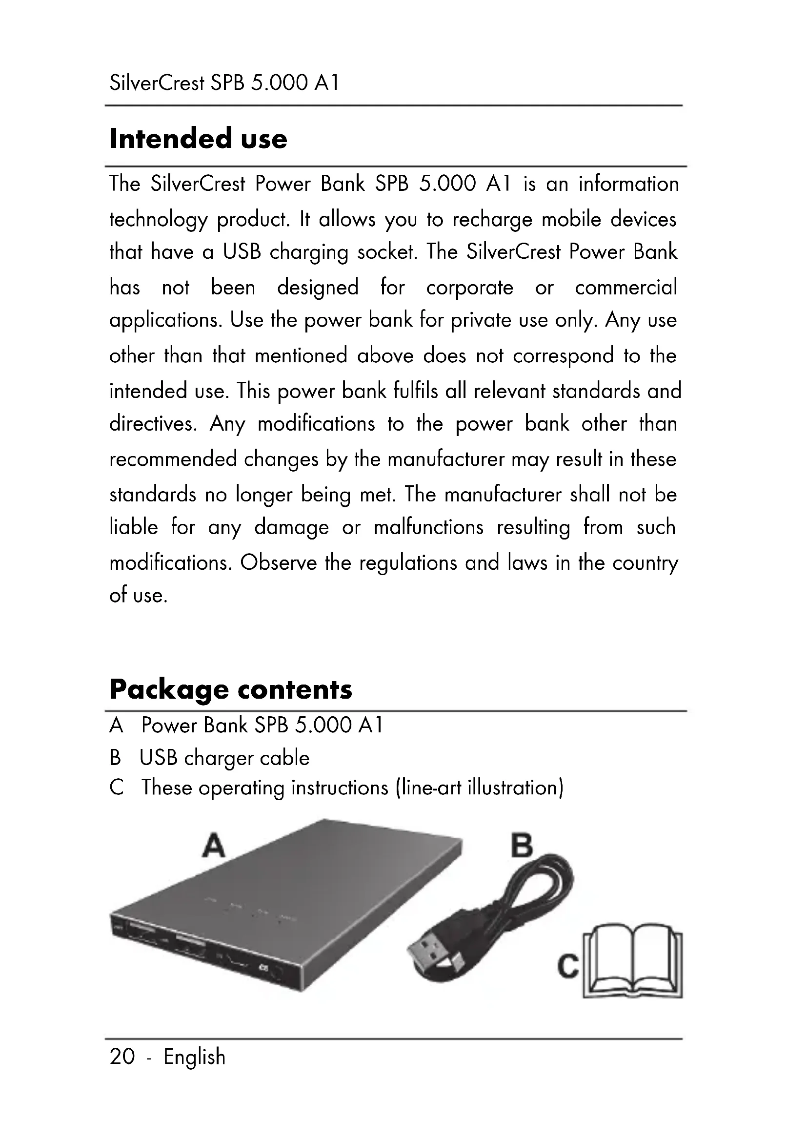 Intended use The SilverCrest Power Bank SPB 5.000 A1 is an information technology product. It allows you to recharge mobile devices that have a USB charging socket. The SilverCrest Power Bank has not been designed for corporate or commercial applications. Use the power bank for private use only. Any use other than that mentioned above does not correspond to the intended use. This power bank fulfils all relevant standards and directives. Any modifications to the power bank other than recommended changes by the manufacturer may result in these standards no longer being met. The manufacturer shall not be liable for any damage or malfunctions resulting from such modifications. Observe the regulations and laws in the country of use. Package contents A Power Bank SPB 5.000 A1 B USB charger cable C These operating instructions (line-art illustration)SilverCrest SPB 5.000 A1 English - 21 Technical specifications Built-in battery 3.7V / 5000mAh Input voltage/current 5V , max. 2.1A Output voltage/current