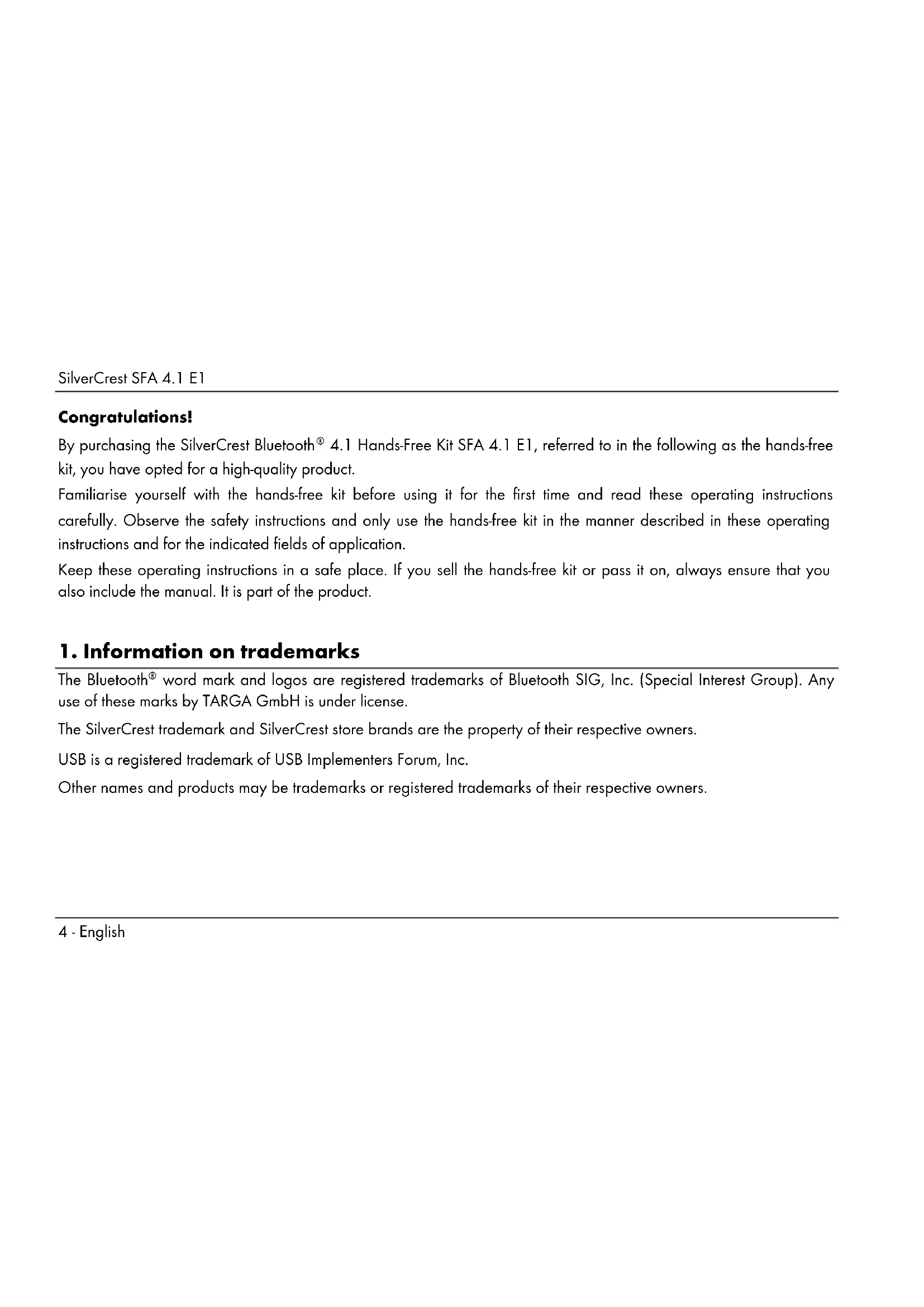 word mark and logos are registered trademarks of Bluetooth SIG, Inc. (Special Interest Group). Any use of these marks by TARGA GmbH is under license. The SilverCrest trademark and SilverCrest store brands are the property of their respective owners. USB is a registered trademark of USB Implementers Forum, Inc. Other names and products may be trademarks or registered trademarks of their respective owners.SilverCrest SFA 4.1 E1 English - 5