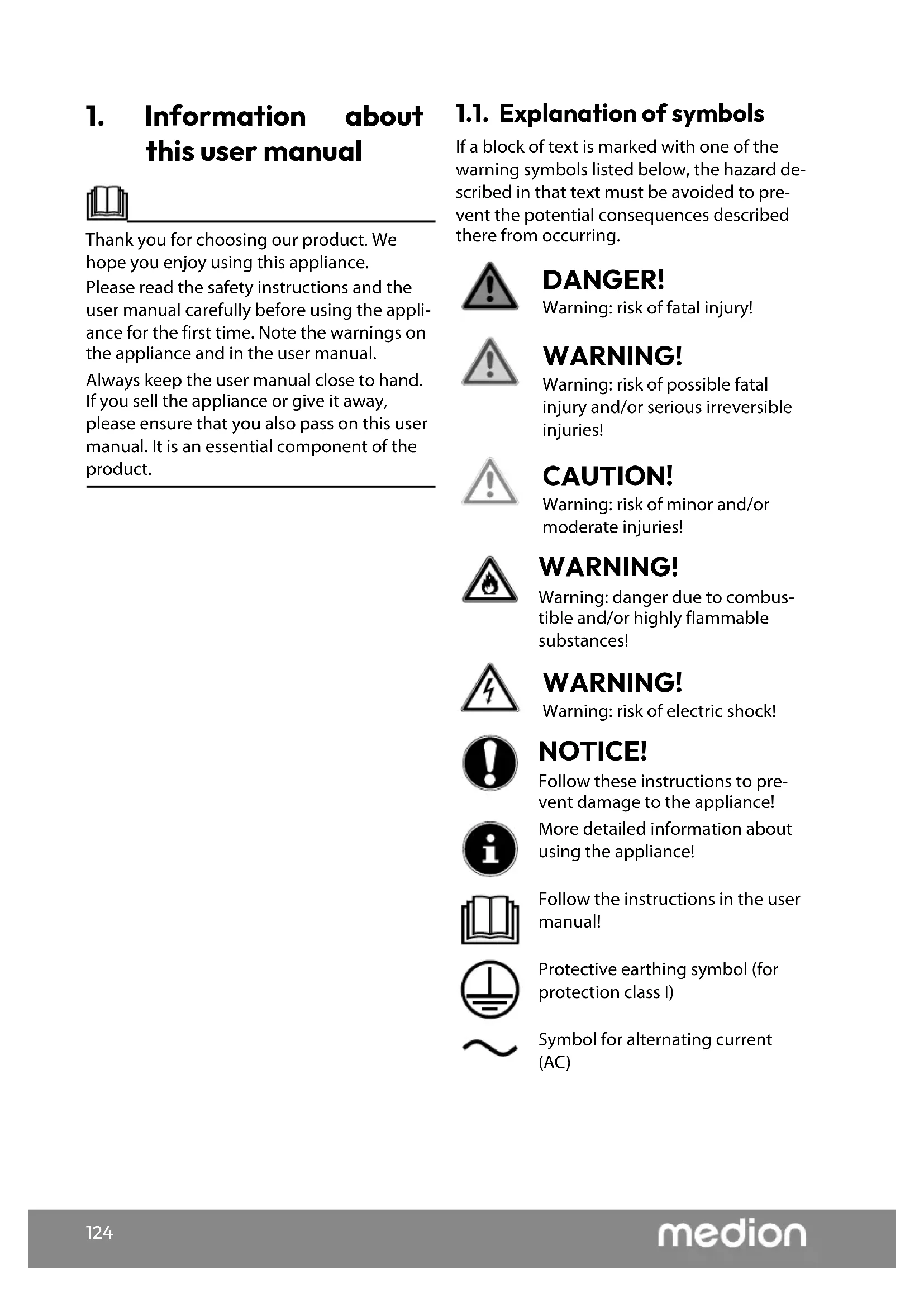 this user manual Thank you for choosing our product. We hope you enjoy using this appliance. Please read the safety instructions and the user manual carefully before using the appli- ance for the first time. Note the warnings on the appliance and in the user manual. Always keep the user manual close to hand. If you sell the appliance or give it away, please ensure that you also pass on this user manual. It is an essential component of the product. 1.1. Explanation of symbols If a block of text is marked with one of the warning symbols listed below, the hazard de- scribed in that text must be avoided to pre- vent the potential consequences described there from occurring. DANGER!