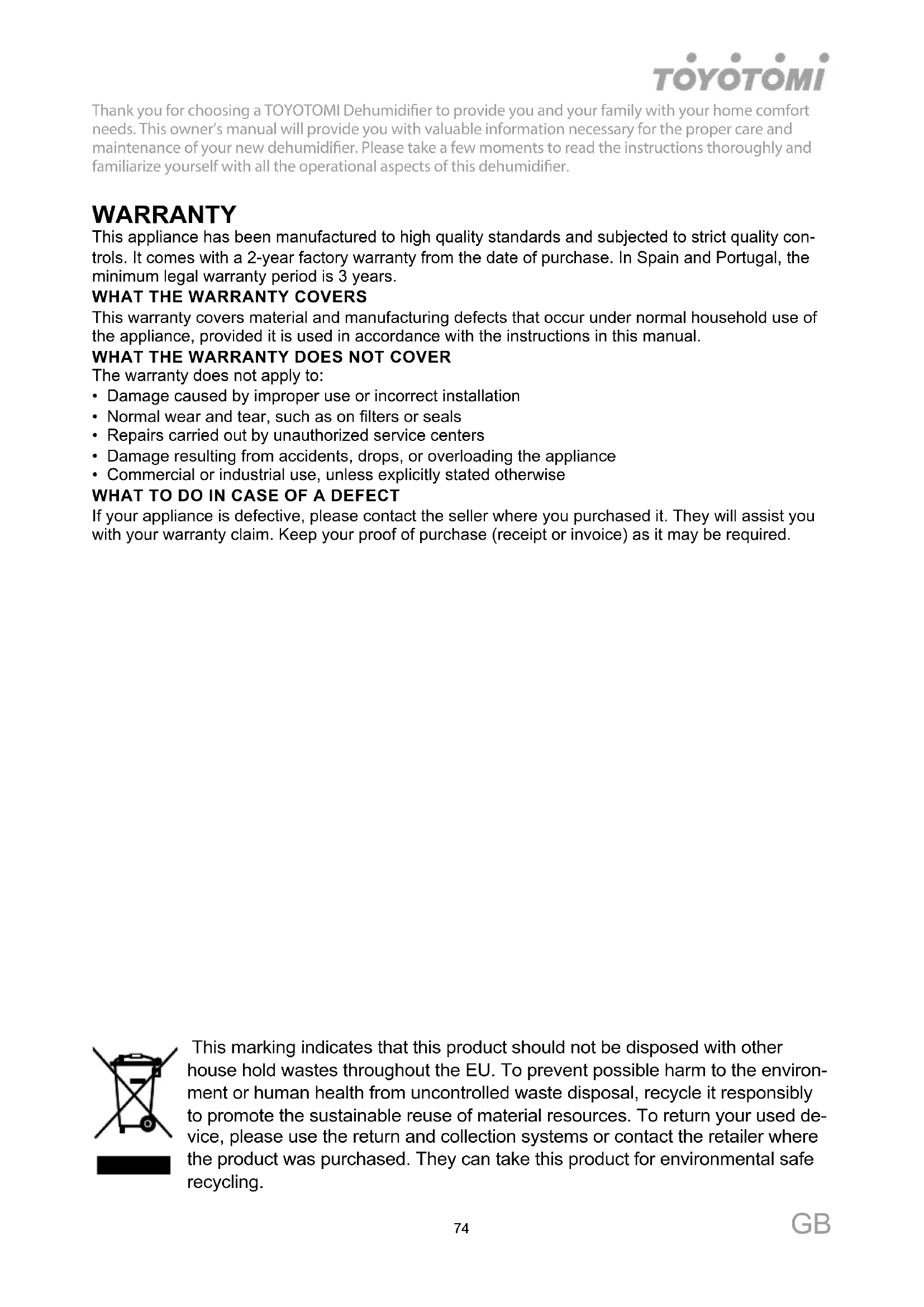 Thank you for choosing a TOYOTOMI Dehumidier to provide you and your family with your home comfort needs. This owner’s manual will provide you with valuable information necessary for the proper care and maintenance of your new dehumidier. Please take a few moments to read the instructions thoroughly and familiarize yourself with all the operational aspects of this dehumidier. WARRANTY This appliance has been manufactured to high quality standards and subjected to strict quality con-trols. It comes with a 2-year factory warranty from the date of purchase. In Spain and Portugal, the minimum legal warranty period is 3 years.WHAT THE WARRANTY COVERSThis warranty covers material and manufacturing defects that occur under normal household use of the appliance, provided it is used in accordance with the instructions in this manual.WHAT THE WARRANTY DOES NOT COVERThe warranty does not apply to:• Damage caused by improper use or incorrect installation• Normal wear and tear, such as on filters or seals• Repairs carried out by unauthorized service centers• Damage resulting from accidents, drops, or overloading the appliance• Commercial or industrial use, unless explicitly stated otherwiseWHAT TO DO IN CASE OF A DEFECTIf your appliance is defective, please contact the seller where you purchased it. They will assist you with your warranty claim. Keep your proof of purchase (receipt or invoice) as it may be required.