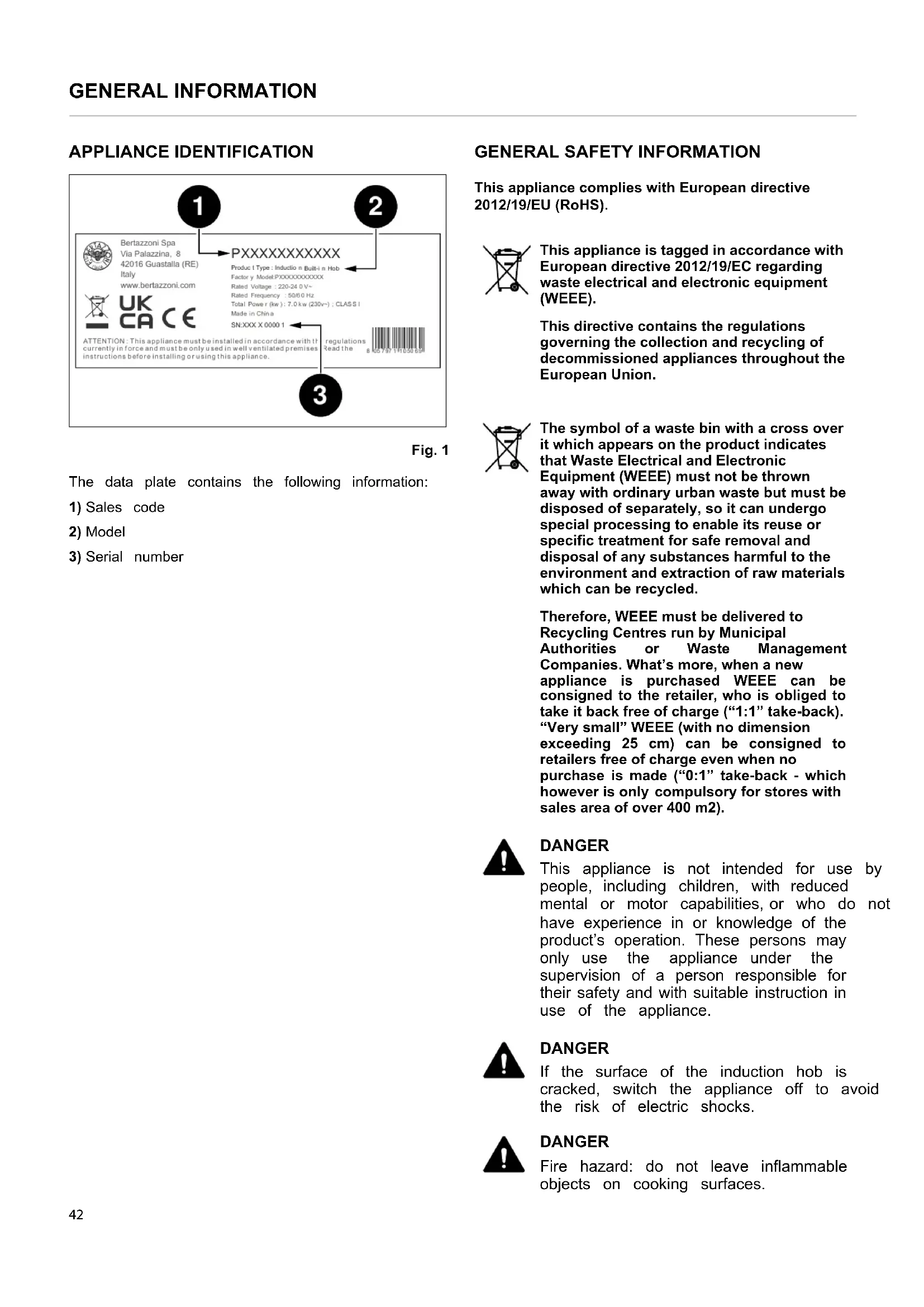 This appliance complies with European directive 2012/19/EU (RoHS). This appliance is tagged in accordance with European directive 2012/19/EC regarding waste electrical and electronic equipment (WEEE). This directive contains the regulations governing the collection and recycling of decommissioned appliances throughout the European Union. The symbol of a waste bin with a cross over it which appears on the product indicates that Waste Electrical and Electronic Equipment (WEEE) must not be thrown away with ordinary urban waste but must be disposed of separately, so it can undergo special processing to enable its reuse or specific treatment for safe removal and disposal of any substances harmful to the environment and extraction of raw materials which can be recycled. Therefore, WEEE must be delivered to Recycling Centres run by Municipal Authorities or Waste Management Companies. What’s more, when a new appliance is purchased WEEE can be consigned to the retailer, who is obliged to take it back free of charge (“1:1” take-back). “Very small” WEEE (with no dimension exceeding 25 cm) can be consigned to retailers free of charge even when no purchase is made (“0:1” take-back - which however is only compulsory for stores with sales area of over 400 m2). DANGER This appliance is not intended for use by people, including children, with reduced mental or motor capabilities, or who do not have experience in or knowledge of the product’s operation. These persons may only use the appliance under the supervision of a person responsible for their safety and with suitable instruction in use of the appliance. DANGER If the surface of the induction hob is cracked, switch the appliance off to avoid the risk of electric shocks. DANGER Fire hazard: do not leave inflammable objects on cooking surfaces. Bertazzoni Spa Via Palazzina, 8 42016 Guastalla (RE)Italywww.bertazzoni.com A T T E N T I O N : T h i s a p p l i a n c e m u s t b e i n s t a l l e d i n a c c o r d a n c e w i t h t h e r e g u l a t i o n s c u r r e n t l y i n f o r c e a n d m u s t b e o n l y u s e d i n w e l l v e n t i l a t e d p r e m i s e s . R e a d t h e i n s t r u c t i o n s b e f o r e i n s t a l l i n g o r u s i n g t h i s a p p l i a n c e . P XXXXXXXXXXX Produc t T ype : Inductio n Built-i n Ho b Factor y Model:PXXXXXXXXXXX Rate d V oltage : 220-24 0 V ~ Rate d Frequency : 50/6 0 H z T ota l Powe r (kw ) : 7. 0 k w (230v~) ; CLAS S I Mad e i n Chin a