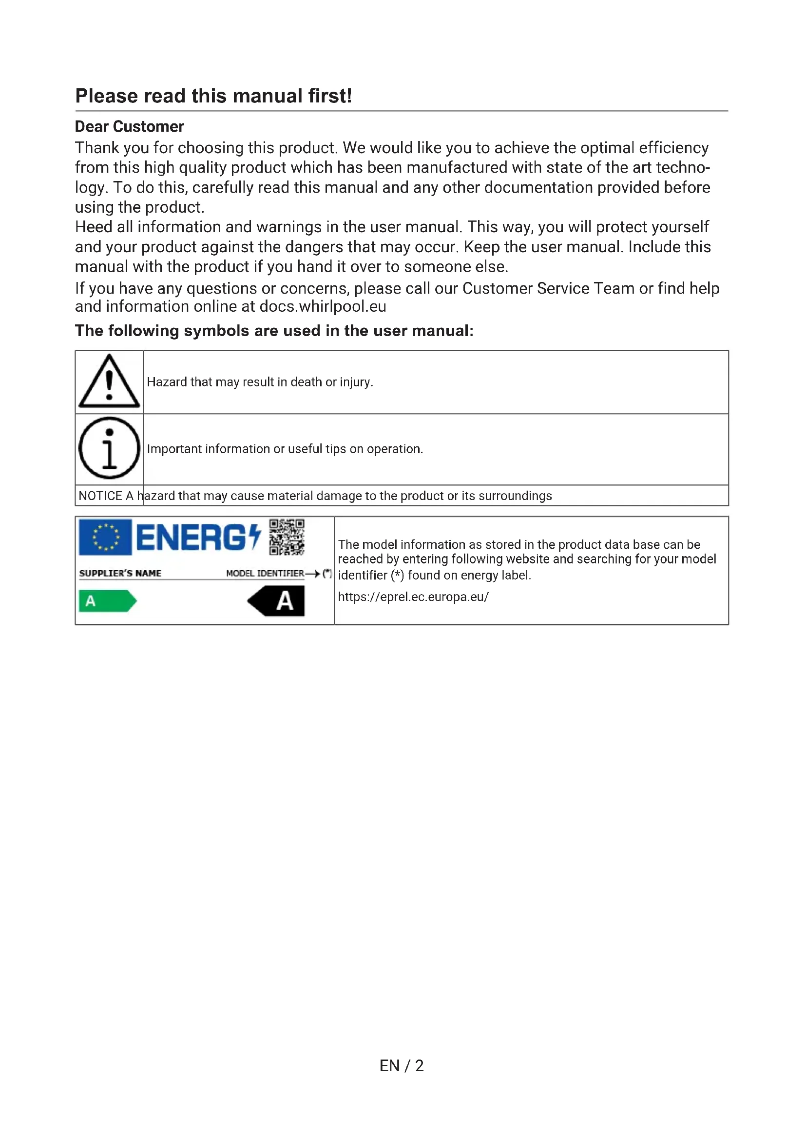SKEN / 2 Please read this manual first! Dear Customer Thank you for choosing this product. We would like you to achieve the optimal efficiency from this high quality product which has been manufactured with state of the art techno- logy. To do this, carefully read this manual and any other documentation provided before using the product. Heed all information and warnings in the user manual. This way, you will protect yourself and your product against the dangers that may occur. Keep the user manual. Include this manual with the product if you hand it over to someone else. If you have any questions or concerns, please call our Customer Service Team or find help and information online at docs.whirlpool.eu The following symbols are used in the user manual: Hazard that may result in death or injury. Important information or useful tips on operation. NOTICE A hazard that may cause material damage to the product or its surroundings The model information as stored in the product data base can be reached by entering following website and searching for your model identifier (*) found on energy label. https://eprel.ec.europa.eu/EN / 3 1 Safety Instructions