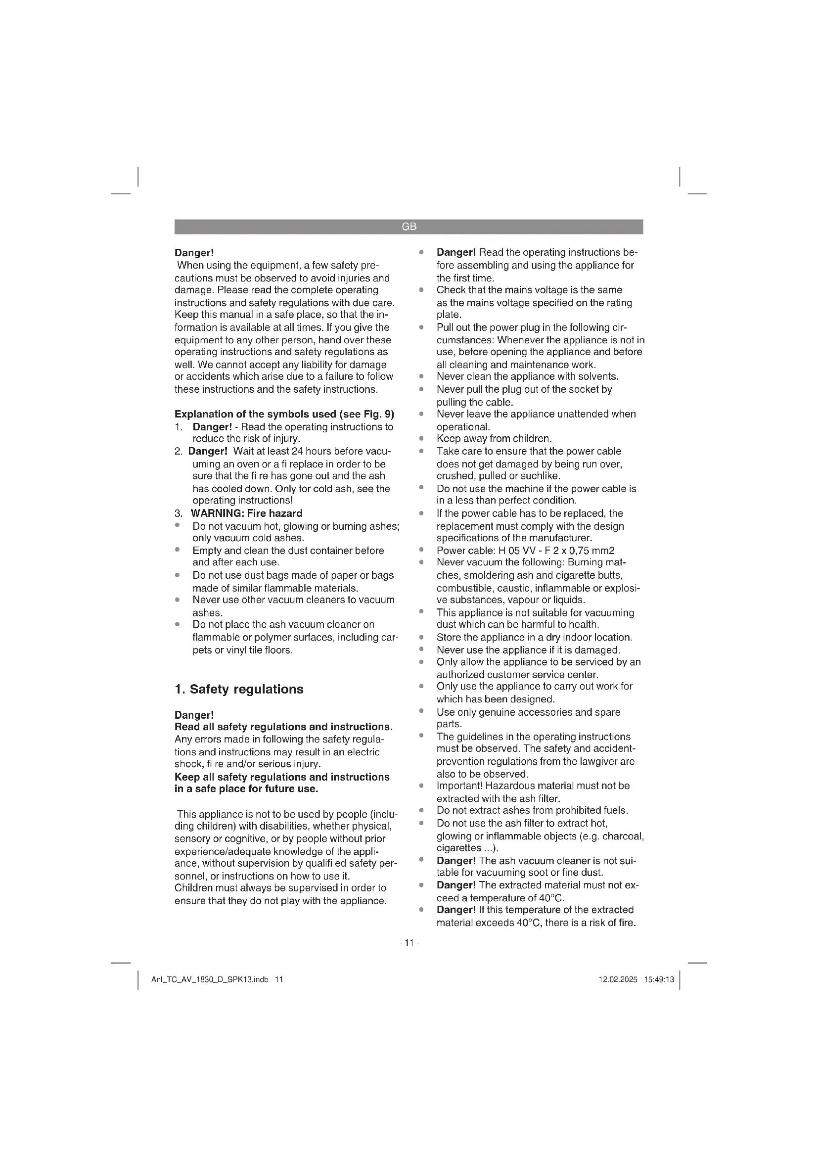 Danger! If this temperature of the extracted material exceeds 40°C, there is a risk of fire. Anl_TC_AV_1830_D_SPK13.indb 11Anl_TC_AV_1830_D_SPK13.indb 11 12.02.2025 15:49:1312.02.2025 15:49:13GB