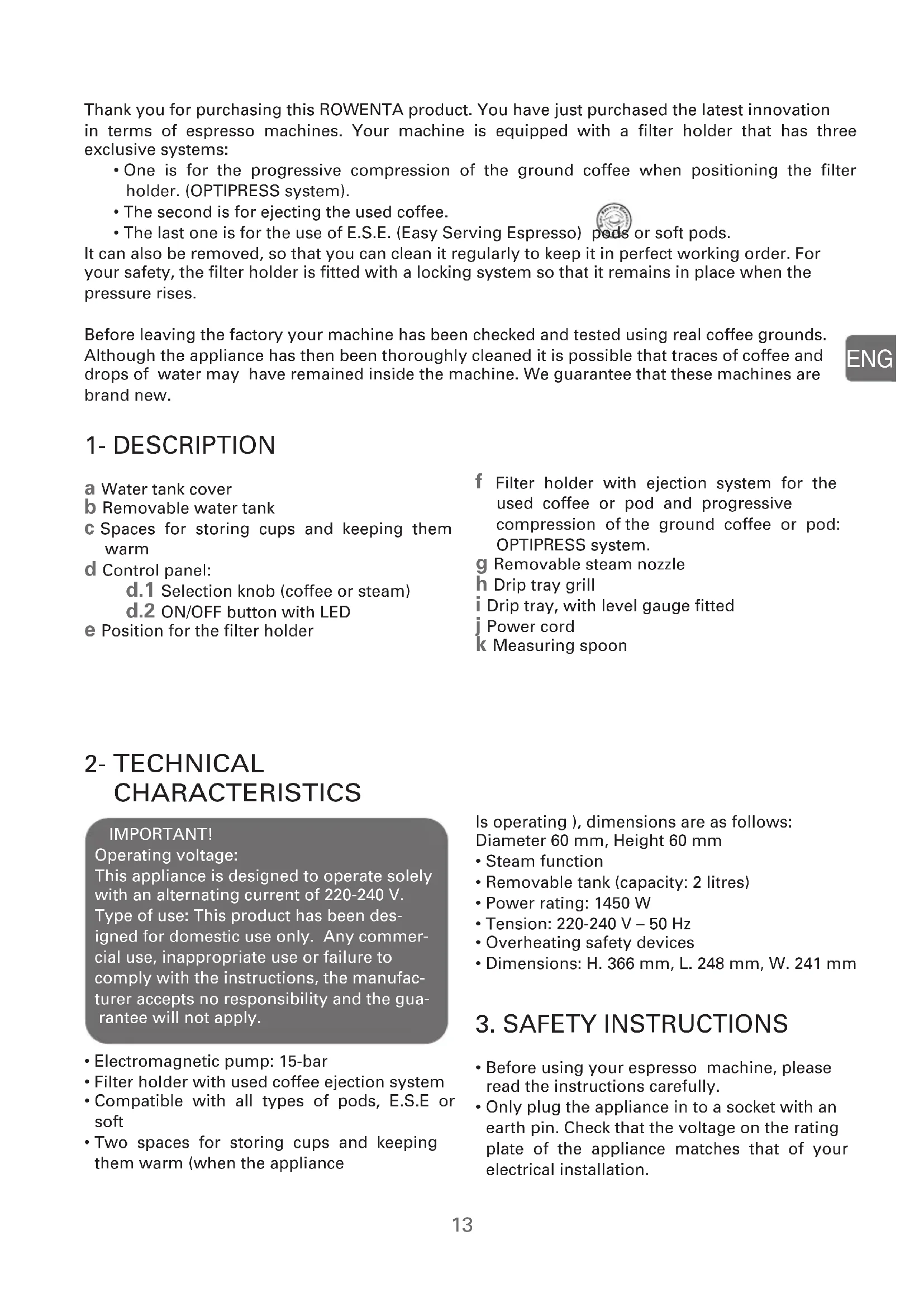 a Water tank cover b Removable water tank c Spaces for storing cups and keeping them warm d Control panel: d.1 Selection knob (coffee or steam) d.2 ON/OFF button with LED e Position for the filter holder f Filter holder with ejection system for the used coffee or pod and progressive compression of the ground coffee or pod: OPTIPRESS system. g Removable steam nozzle h Drip tray grill i Drip tray, with level gauge fitted j Power cord k Measuring spoon Thank you for purchasing this ROWENTA product. You have just purchased the latest innovation in terms of espresso machines. Your machine is equipped with a filter holder that has three exclusive systems: