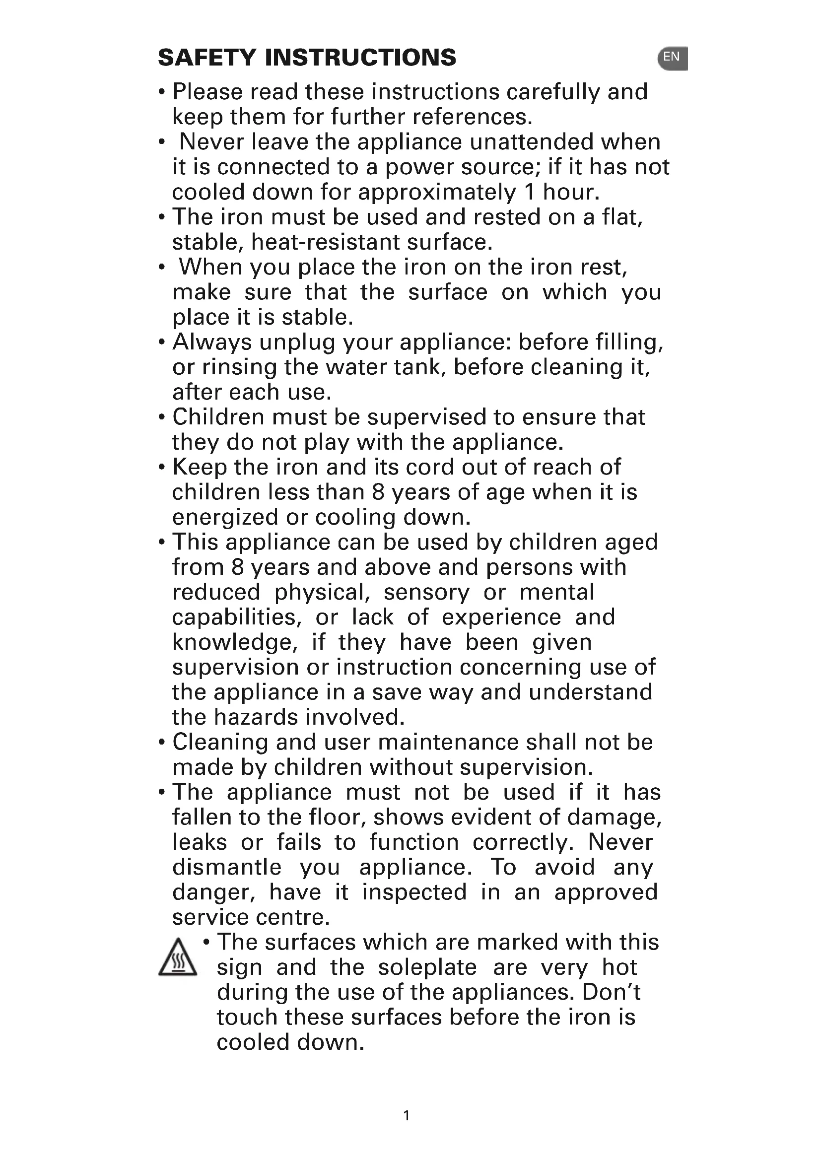 - Never leave the appliance unattended when it is connected to a power source; if it has not cooled down for approximately 1 hour.