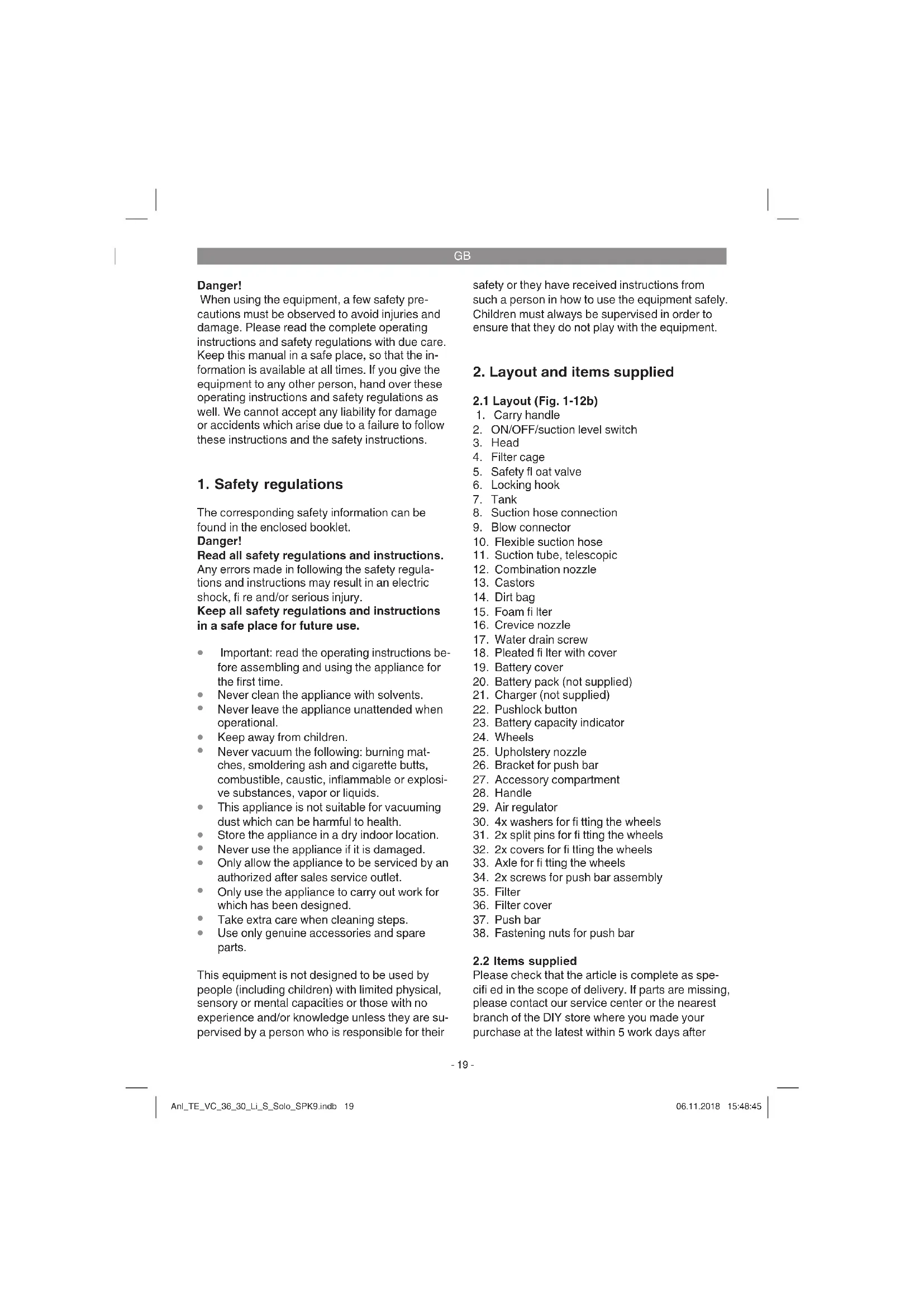 Please check that the article is complete as spe- cifi ed in the scope of delivery. If parts are missing, please contact our service center or the nearest branch of the DIY store where you made your purchase at the latest within 5 work days after Anl_TE_VC_36_30_Li_S_Solo_SPK9.indb 19Anl_TE_VC_36_30_Li_S_Solo_SPK9.indb 19 06.11.2018 15:48:4506.11.2018 15:48:45GB