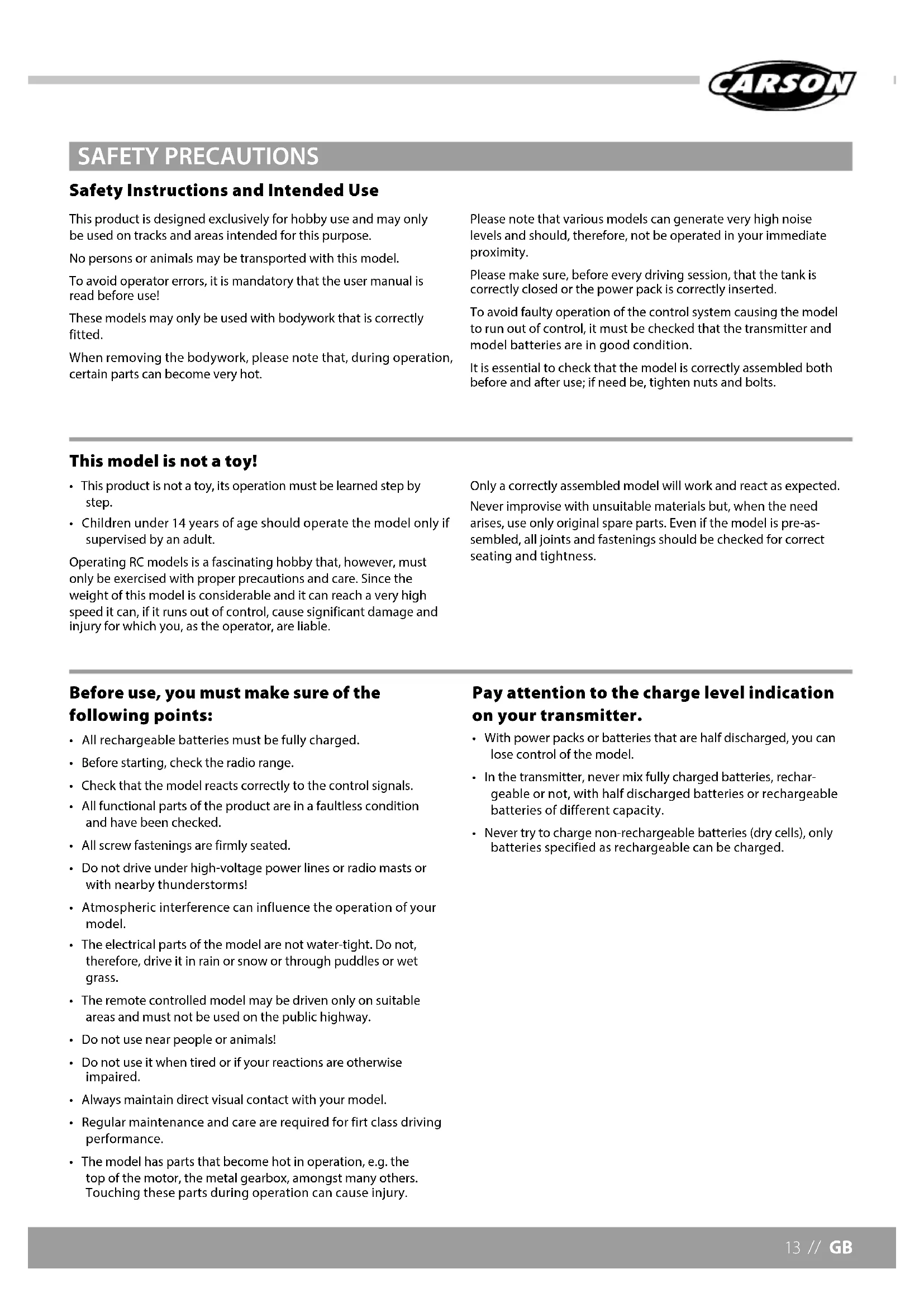 - Never try to charge non-rechargeable batteries (dry cells), only batteries specified as rechargeable can be charged. Safety Instructions and Intended Use This product is designed exclusively for hobby use and may only be used on tracks and areas intended for this purpose. No persons or animals may be transported with this model. To avoid operator errors, it is mandatory that the user manual is read before use! These models may only be used with bodywork that is correctly fitted. When removing the bodywork, please note that, during operation, certain parts can become very hot. Please note that various models can generate very high noise levels and should, therefore, not be operated in your immediate proximity. Please make sure, before every driving session, that the tank is correctly closed or the power pack is correctly inserted. To avoid faulty operation of the control system causing the model to run out of control, it must be checked that the transmitter and model batteries are in good condition. It is essential to check that the model is correctly assembled both before and after use; if need be, tighten nuts and bolts. SAFETY PRECAUTIONSGB // 14