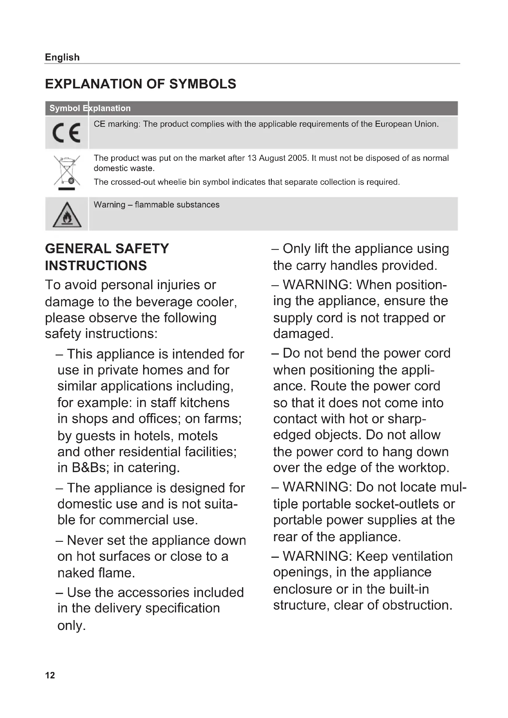 Symbol Explanation CE marking: The product complies with the applicable requirements of the European Union. The product was put on the market after 13 August 2005. It must not be disposed of as normal domestic waste. The crossed-out wheelie bin symbol indicates that separate collection is required. Warning – ammable substances GENERAL SAFETY INSTRUCTIONS To avoid personal injuries or damage to the beverage cooler, please observe the following safety instructions: – This appliance is intended for use in private homes and for similar applications including, for example: in sta kitchens in shops and oces; on farms; by guests in hotels, motels and other residential facilities; in B&Bs; in catering. – The appliance is designed for domestic use and is not suita- ble for commercial use. – Never set the appliance down on hot surfaces or close to a naked ame. – Use the accessories included in the delivery specication only. – Only lift the appliance using the carry handles provided. – WARNING: When position- ing the appliance, ensure the supply cord is not trapped or damaged. – Do not bend the power cord when positioning the appli- ance. Route the power cord so that it does not come into contact with hot or sharp- edged objects. Do not allow the power cord to hang down over the edge of the worktop. – WARNING: Do not locate mul- tiple portable socket-outlets or portable power supplies at the rear of the appliance. – WARNING: Keep ventilation openings, in the appliance enclosure or in the built-in structure, clear of obstruction.13 – When positioning the appli- ance, ensure that a sucient distance of approx. 5 cm is kept between the appliance and the surrounding walls or other boundaries. – Only use the appliance after it has been securely positioned. After transport, the appliance must be left unmoved in the same location for at least 12 hours before being used for the rst time. – Never transport the appliance in a horizontal position! The appliance must always be kept in an upright position, even when not in use, to prevent damage to the cooling system. – Never open the lower section of the appliance, which con- tains the cooling system. – Children over 8 years of age as well as persons with reduced physical, sensory or intellectual capabilities or persons lacking in relevant experience and/or knowledge may also use this appliance, provided that they do so under supervision or have been instructed in the safe use of the appliance and understand the potential risks associated with its use. – Do not allow children to play with the appliance. – Children aged between 3 and 8 years of age can load and unload the appliance but must be kept away from the connection cable. – Children must not be permit- ted to clean or perform user maintenance on the appliance unless they are over 8 years of age and are supervised. – The mobile app can only be used to activate the BEEZER