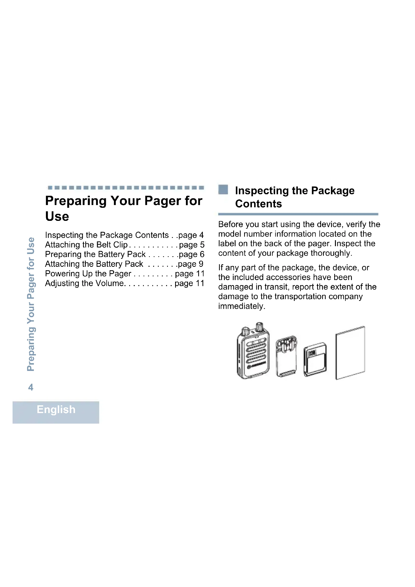 Preparing Your Pager for Use Inspecting the Package Contents ...page 4 Attaching the Belt Clip ... page 5 Preparing the Battery Pack ...page 6 Attaching the Battery Pack ...page 9 Powering Up the Pager ... page 11 Adjusting the Volume... page 11 Inspecting the Package Contents Before you start using the device, verify the model number information located on the label on the back of the pager. Inspect the content of your package thoroughly. If any part of the package, the device, or the included accessories have been damaged in transit, report the extent of the damage to the transportation company immediately. 68009690001_.book Page 4 Tuesday, June 13, 2017 9:29 AMPreparing Your Pager for Use