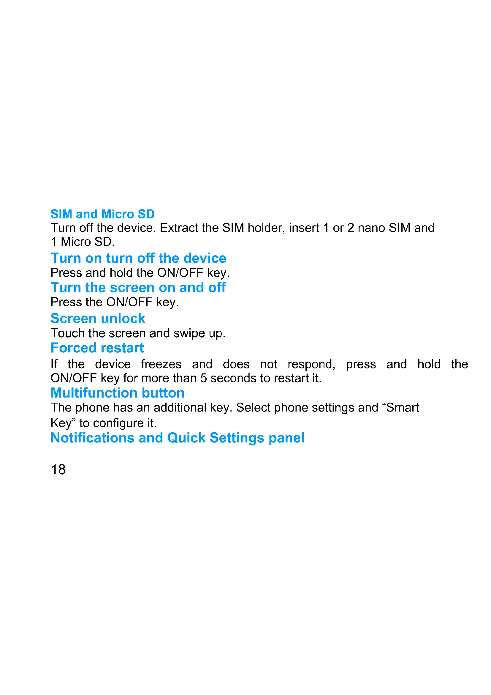 For more information Visit the website www.saiet.it. Operational elements 1 SIM and Micro SD holder 2 Multifunction key 3 Volume keys 4 ON/OFF key 5 USB Type-C connector 17SIM and Micro SD Turn off the device. Extract the SIM holder, insert 1 or 2 nano SIM and 1 Micro SD. Turn on turn off the device Press and hold the ON/OFF key. Turn the screen on and off Press the ON/OFF key. Screen unlock Touch the screen and swipe up. Forced restart If the device freezes and does not respond, press and hold the ON/OFF key for more than 5 seconds to restart it. Multifunction button The phone has an additional key. Select phone settings and “Smart Key” to configure it. Notifications and Quick Settings panel 18To open notifications swipe downwards on the top left of the screen, for quick settings swipe downwards on the top right of the screen. Battery The phone has a built-in battery, do not try to open it and replace the battery but contact specialized technical assistance personnel. Battery charger Use the included charger or a 10W charger for maximum charging speed. 19Safety information Read the following warnings, failure to comply with them may be dangerous or illegal. - Switch off the phone when its use is prohibited or when it may cause interference and danger. - Switch off the phone in hospitals and near medical equipment. - Turn off the phone on the airplane. Mobile phones can cause interference with on-board instrumentation. - Do not use the mobile phone while driving. In any case, comply with the road rules in force. - Switch off the phone when refueling, near combustibles, explosive materials. - Maintain a minimum distance of 15 cm between the mobile phone and the pacemaker to avoid possible interference with the pacemaker. Do not carry your cell phone in a breast pocket.