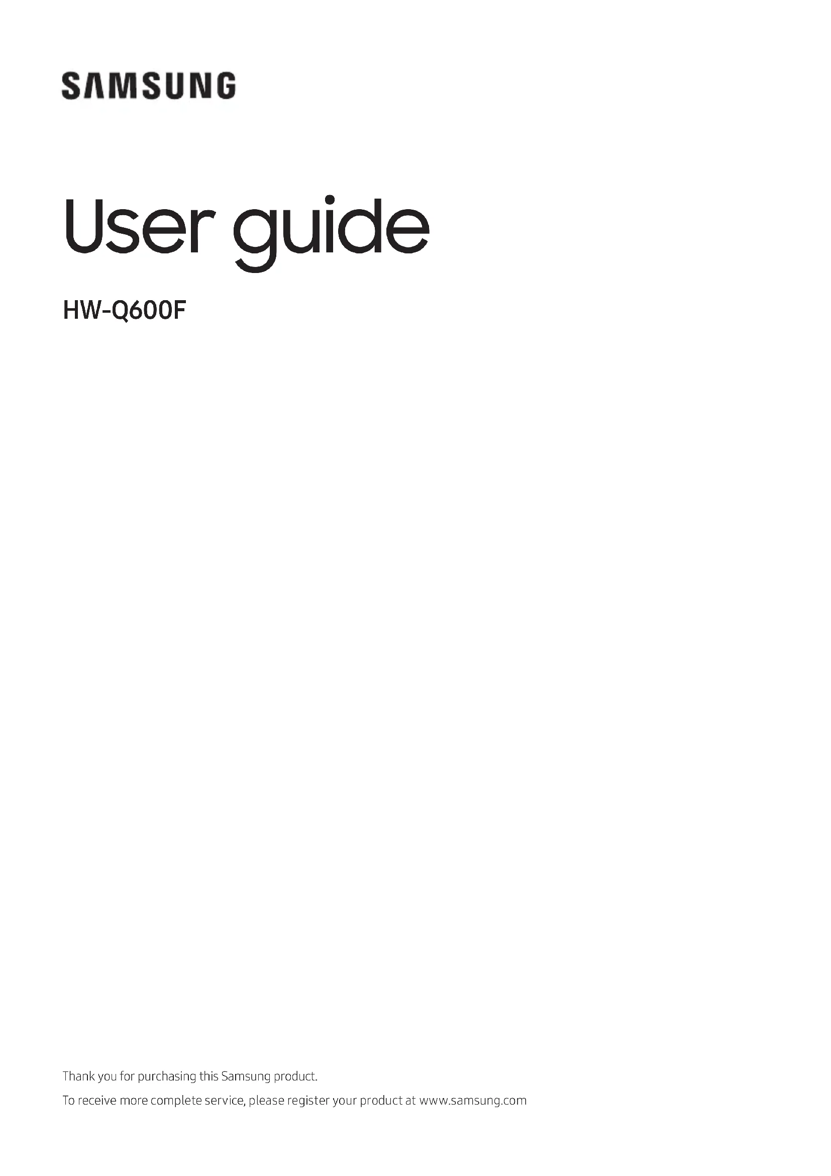 User guide Thank you for purchasing this Samsung product. To receive more complete service, please register your product at www.samsung.com HW-Q600FEnglish - 2 SAFETY INFORMATION SAFETY WARNINGS TO REDUCE THE RISK OF ELECTRIC SHOCK, DO NOT REMOVE THE COVER (OR BACK). NO USER-SERVICEABLE PARTS ARE INSIDE.