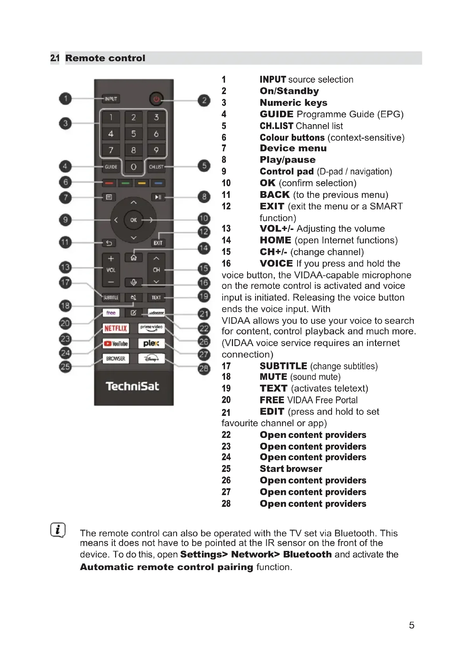 Open content providers The remote control can also be operated with the TV set via Bluetooth. This means it does not have to be pointed at the IR sensor on the front of the device. To do this, open Settings> Network> Bluetooth and activate the Automatic remote control pairing function.6