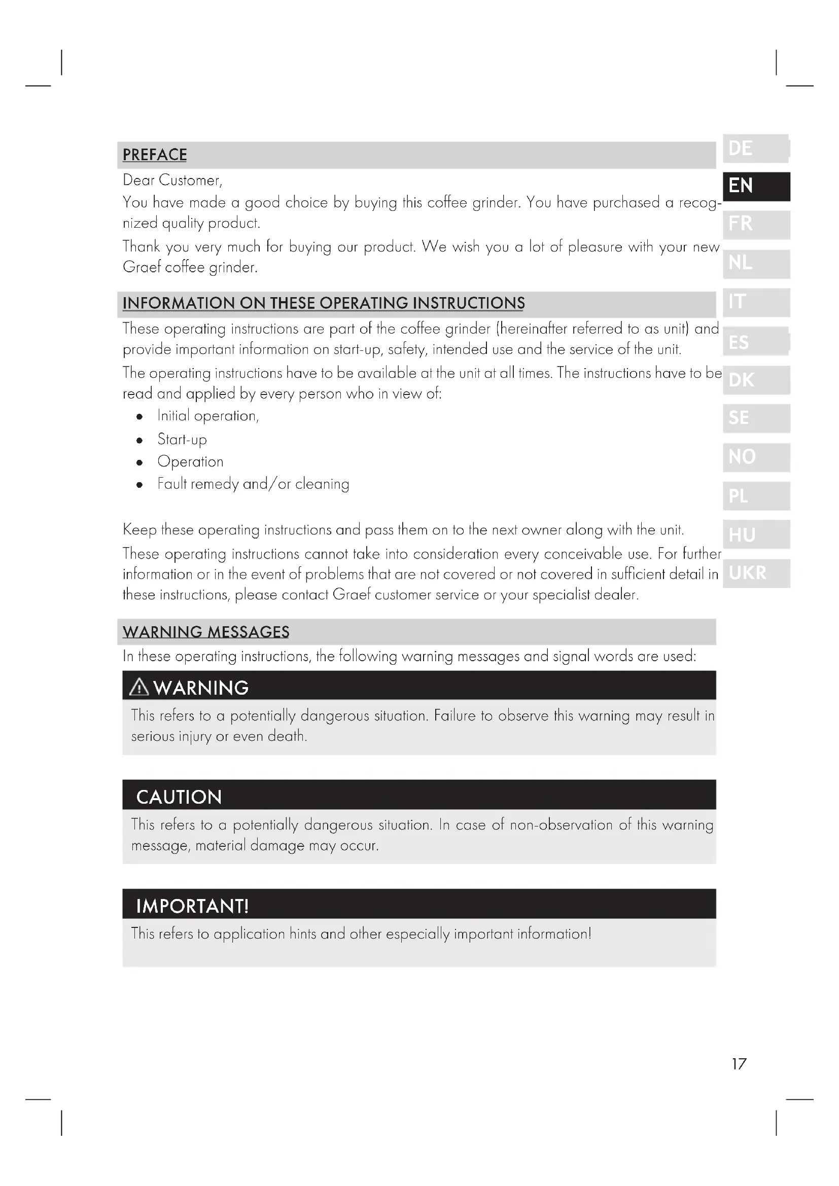 These operating instructions are part of the coffee grinder (hereinafter referred to as unit) and provide important information on start-up, safety, intended use and the service of the unit. The operating instructions have to be available at the unit at all times. The instructions have to be read and applied by every person who in view of: ● Initial operation, ● Start-up ● Operation ● Fault remedy and/or cleaning Keep these operating instructions and pass them on to the next owner along with the unit. These operating instructions cannot take into consideration every conceivable use. For further information or in the event of problems that are not covered or not covered in sufficient detail in these instructions, please contact Graef customer service or your specialist dealer. WARNING MESSAGES In these operating instructions, the following warning messages and signal words are used: WARNING This refers to a potentially dangerous situation. Failure to observe this warning may result in serious injury or even death. CAUTION This refers to a potentially dangerous situation. In case of non-observation of this warning message, material damage may occur. IMPORTANT! This refers to application hints and other especially important information!18